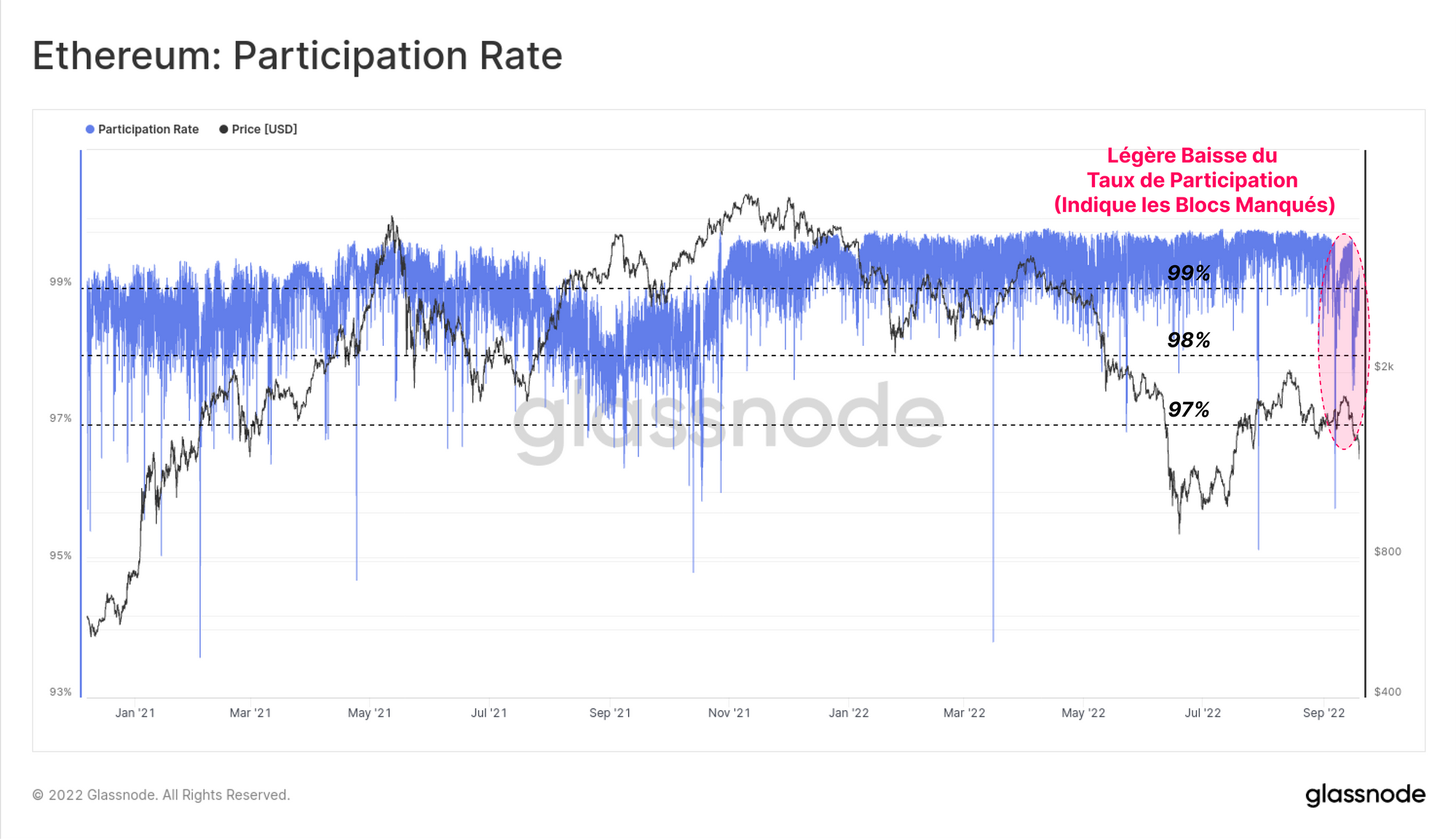Dans les semaines précédant le Merge, un léger déclin du taux de participation peut être observé, tombant sous le niveau typique de 99% à environ 97,5%. Après le Merge, ce taux est revenu dans la fourchette des 99% et plus, ce qui suggère qu'il n'y a eu qu'une brève perturbation pour un sous-ensemble de valideurs.