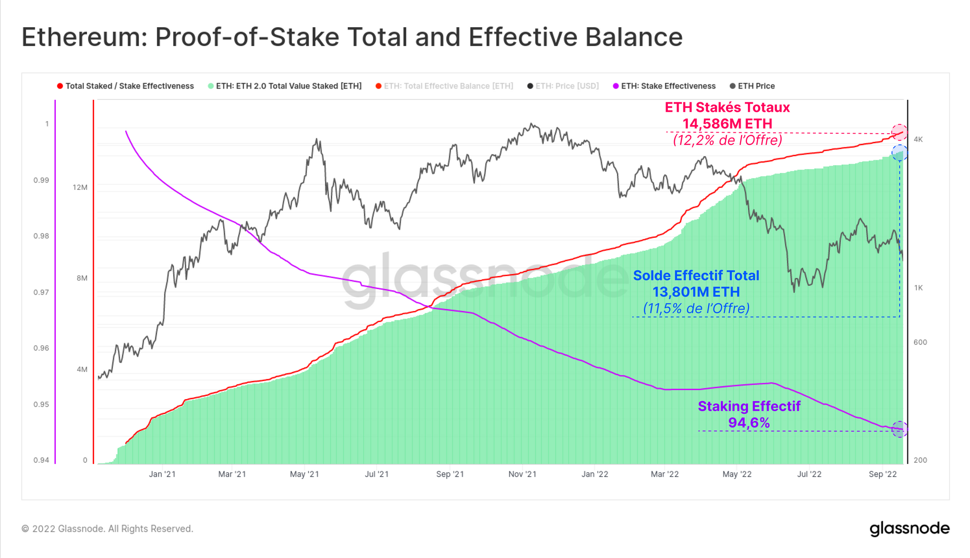 Le solde effectif total est actuellement de 13,801M ETH, ce qui donne un Staking Effectif de 94,6%.