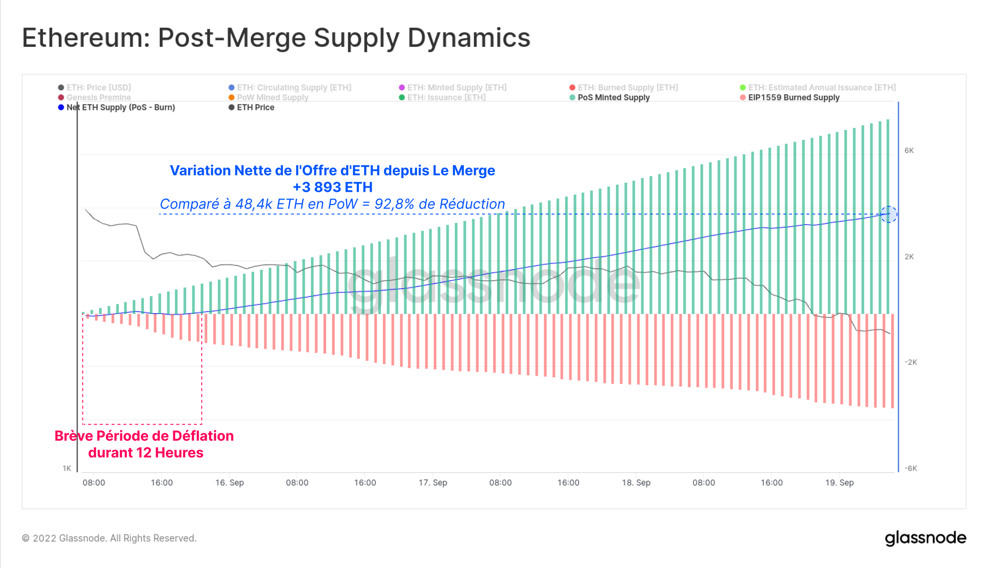 En zoomant sur le graphique horaire à partir de l'événement du Merge, nous pouvons calculer la réduction nette de l'offre qui a eu lieu. Entre le Merge et le moment de l'écriture (~4 jours après le fait) :