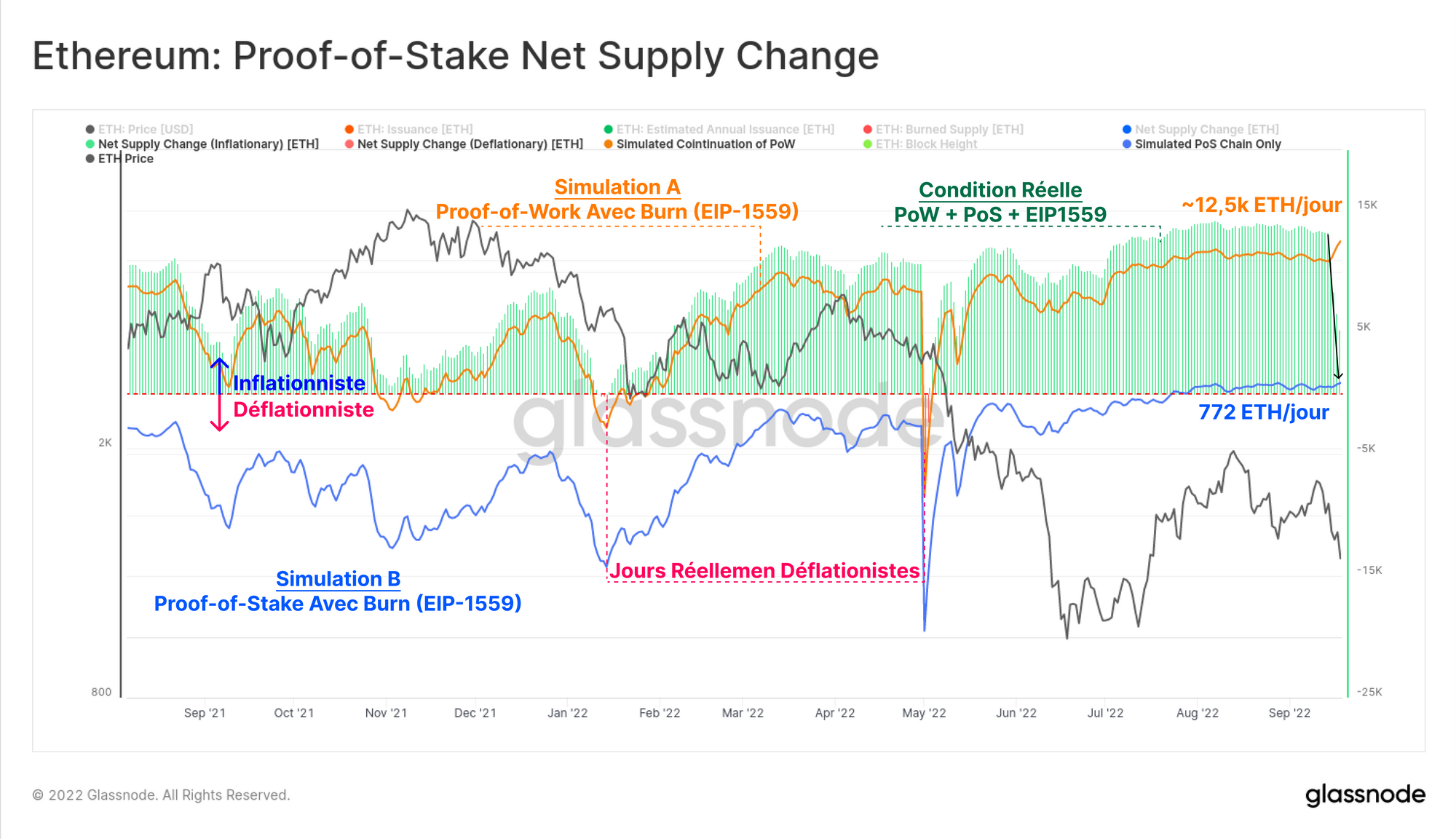 On peut voir que le modèle PoS 🔵 présente un taux d'émission nettement inférieur de ~772 ETH/jour, contre ~12,5k ETH pour le modèle PoW 🟠. Toutefois, on note que l'émission nette d'ETH est, à l'heure actuelle, toujours inflationniste. Cela résulte principalement de la congestion extrêmement faible de la blockchain et de la faible utilisation du réseau en ce moment.