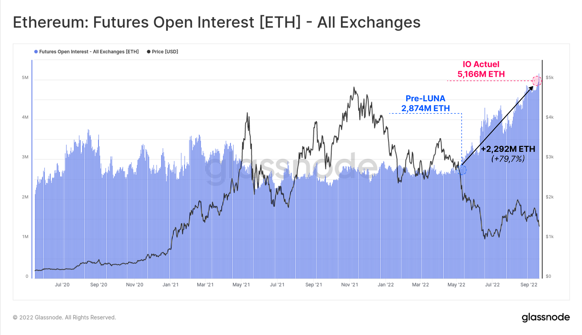 Si nous examinons l'intérêt en cours sur une base libellée en ETH, nous pouvons constater que l'intérêt en cours sur les contrats à terme n'a jamais été aussi élevé, ayant augmenté de près de 80 % depuis début mai.