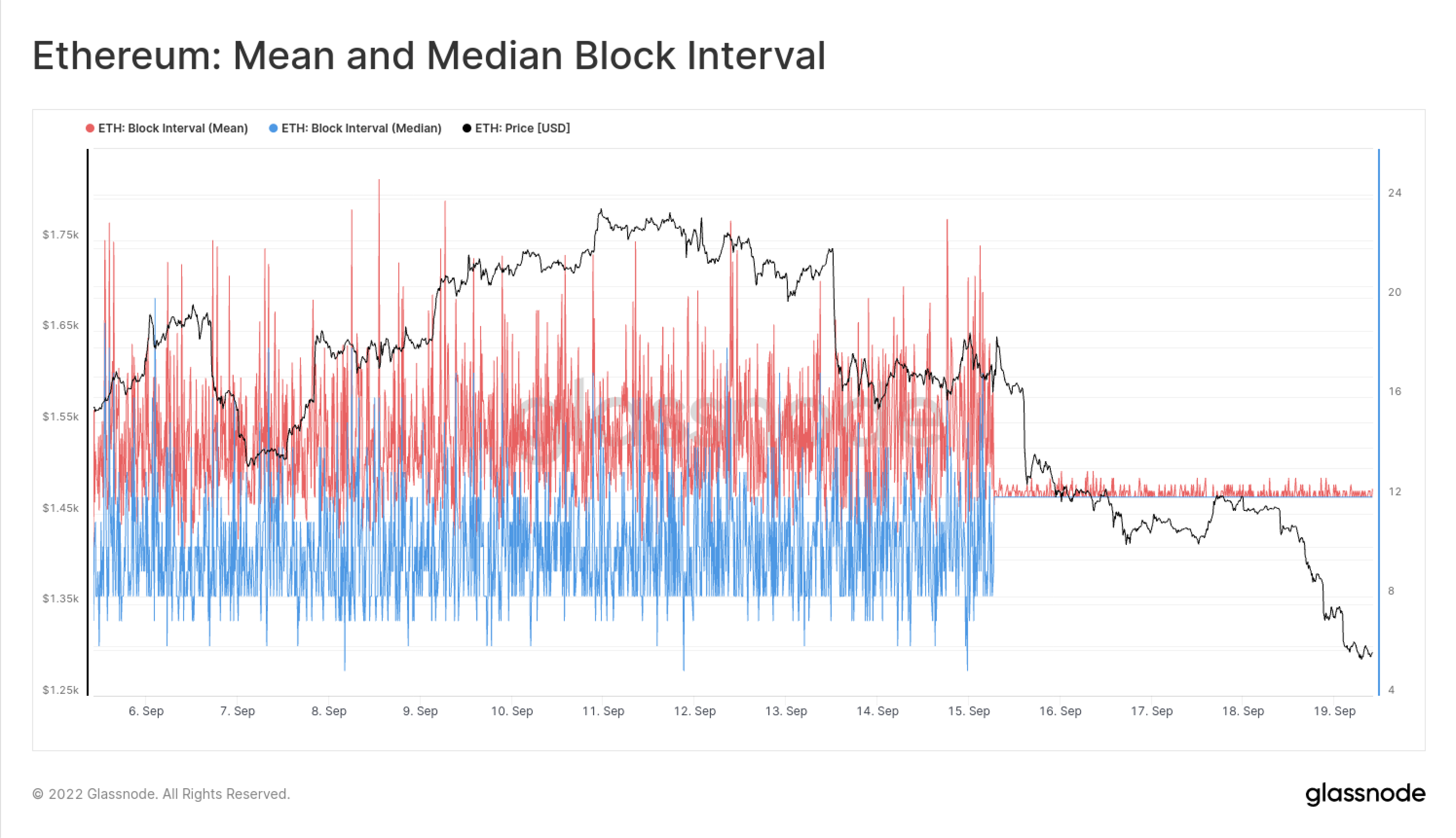 Ici, nous pouvons clairement voir la fin de l'extraction probabiliste et naturellement variable du PoW, et le passage à la précision technique du PoS, avec un temps de bloc constant de 12 secondes.