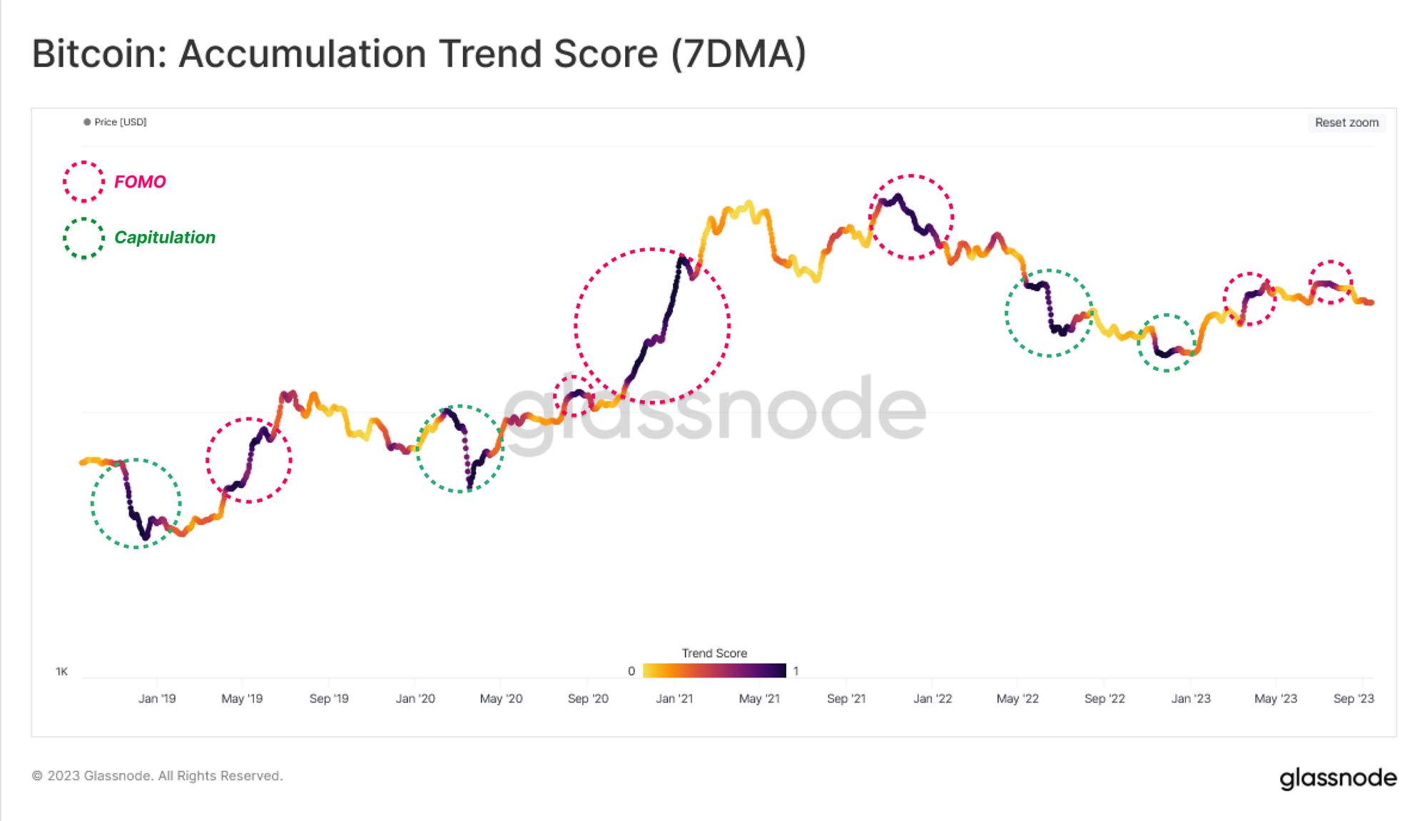 Ici, nous pouvons voir que la reprise de 2023 a été alimentée par une accumulation significative proche des sommets locaux, notammen aux abords des 30k $. Cela décrit un certain degré de FOMO 🔴 de la part des investisseurs.