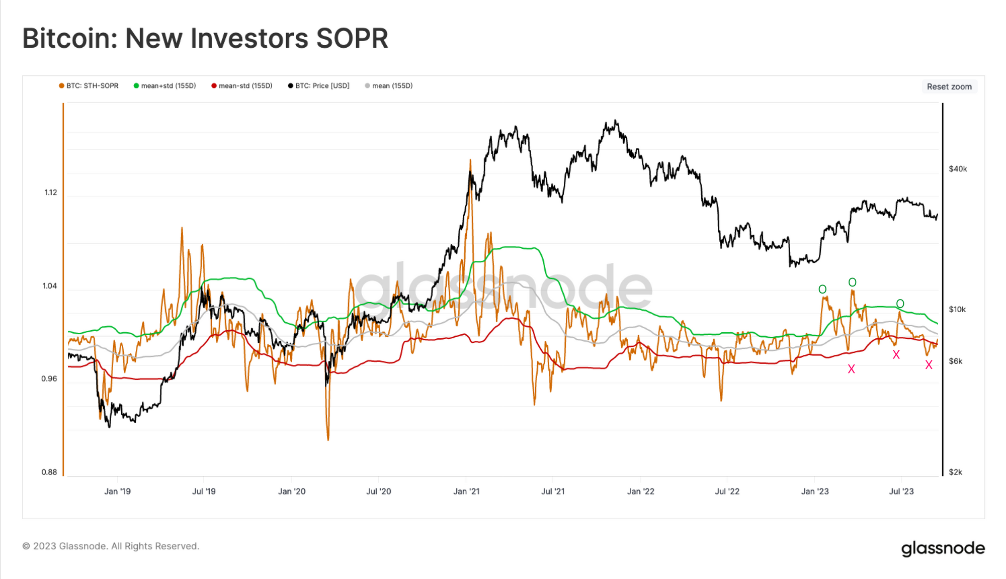 Le STH-SOPR présente un comportement similaire, ce qui indique que ces investisseurs ont également agi, choisissant de prendre des profit à proximité des sommets et de vendre des pièces avec une perte statistiquement significative à proximité des creux.