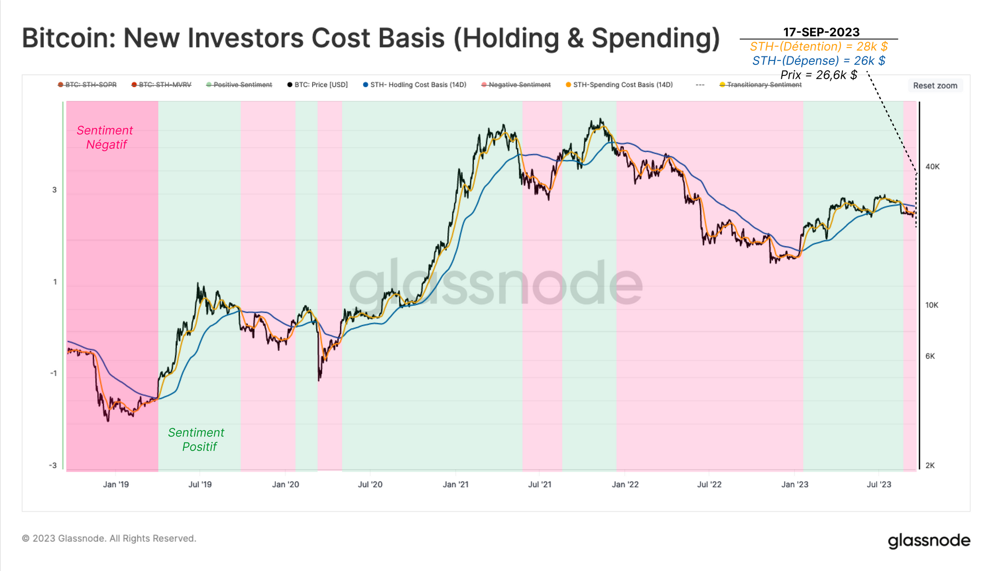 - 🟩 Le sentiment est positif lorsque la base de coût des vendeurs est plus élevée que celle des détenteurs.