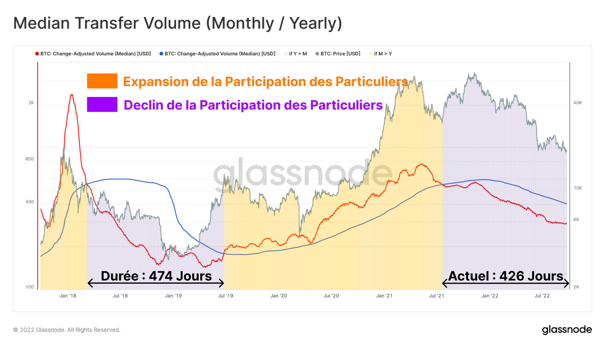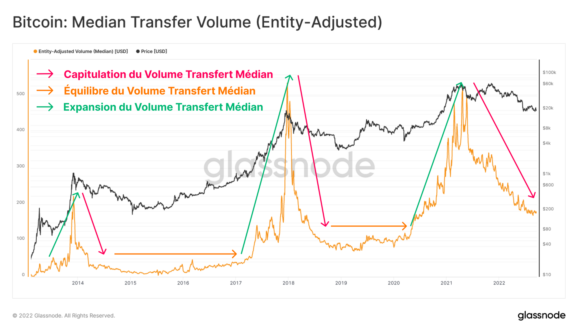 - Un volume de transfert médian stable s'est historiquement produit après une expulsion des détaillants, ce qui indique une utilisation stable des participants restants (HODLers, traders, baleines).