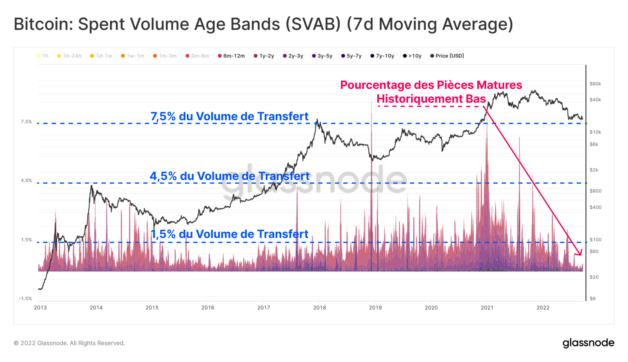 La mesure du volume dépensé par tranches d'âge fournit une séparation des volumes de transfert sur la chaîne par tranches d'âge afin d'évaluer si les dépenses sont dominées par les anciennes mains qui perdent leur conviction, ou non.