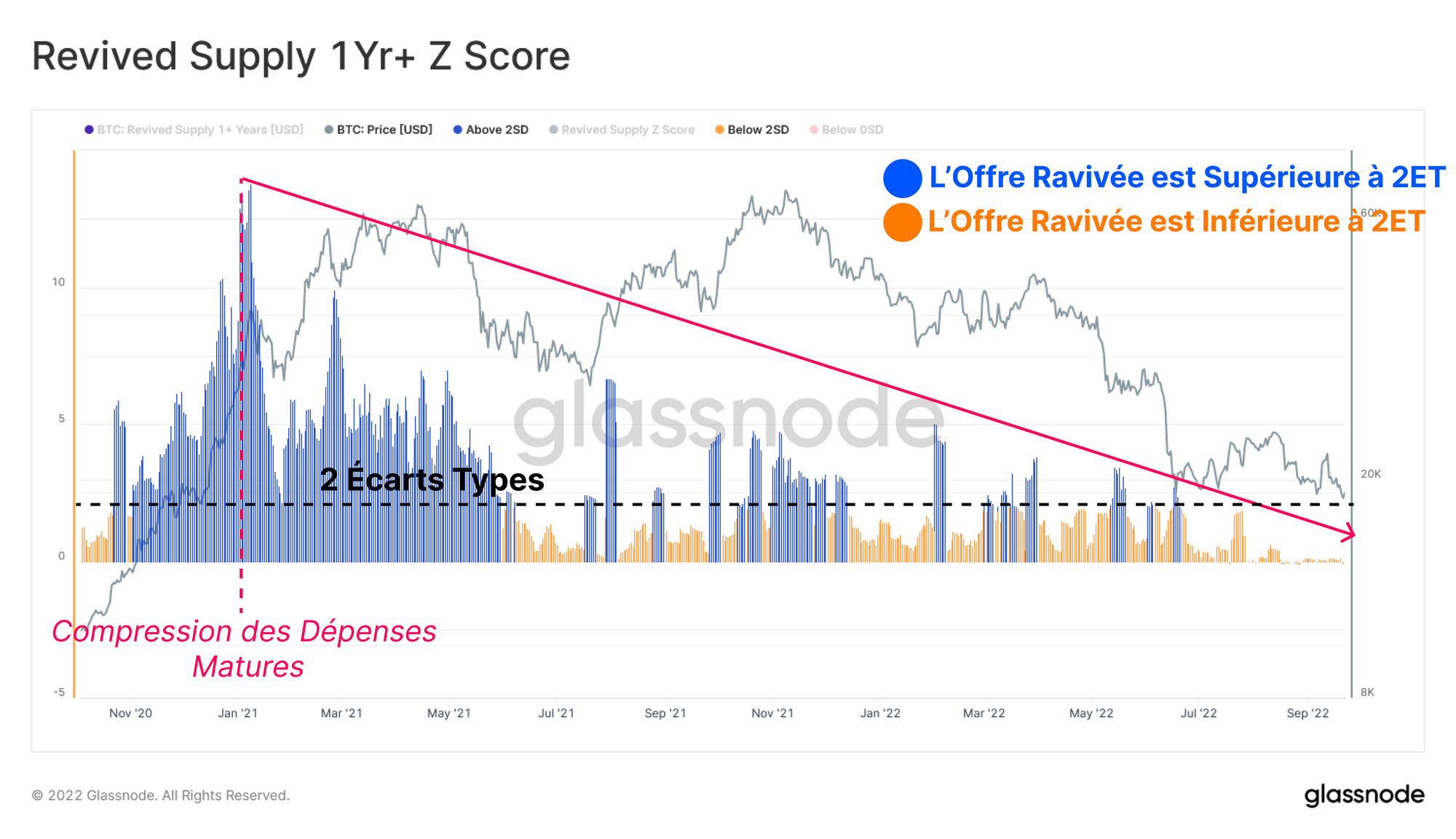 - Alors que les prix s'effondrent à nouveau vers 20k$ en 2022, le marché a répondu par une réaction opposée, une période soutenue de dépenses de pièces matures exceptionnellement faibles, la plus calme depuis les creux du marché baissier de 2018 sur une base statistique.