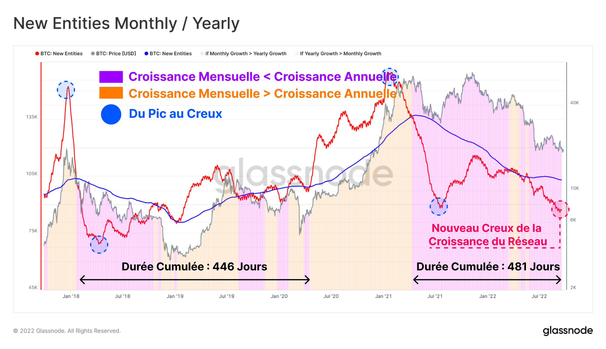 Au sein du cycle actuel, la croissance du réseau est entrée pour la première fois dans un régime de contraction il y a 533 jours, avec seulement une brève période de répit de 52 jours en mars-avril 2022. Le marché baissier 2018-20 a encore quelques périodes de reprise de l'adoption, notamment autour du rallye de mi-2019 à 14k $.