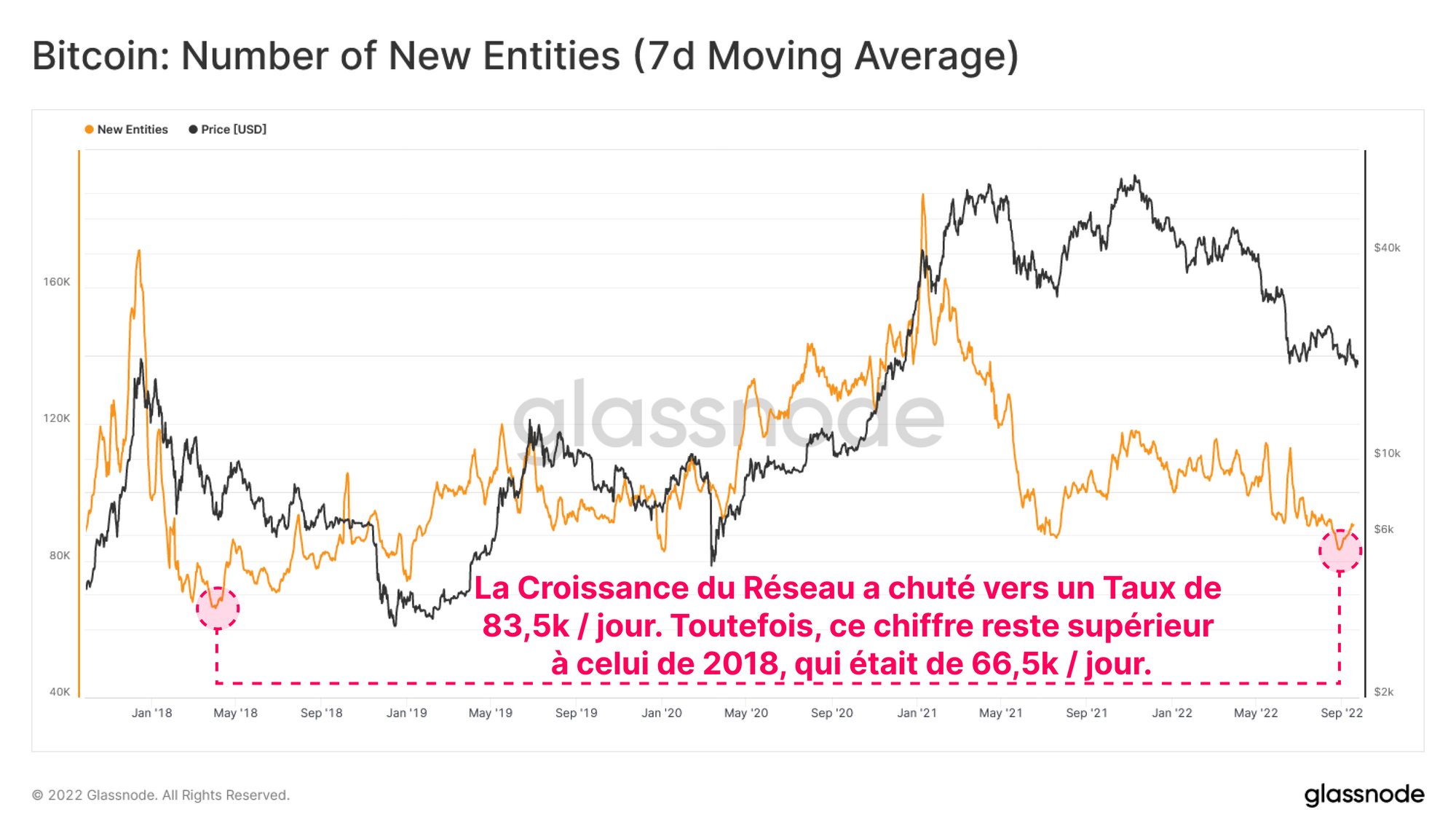 Ici, nous pouvons voir qu'environ 83,5k nouvelles entités joignent le réseau chaque jour, ce qui constitue un nouveau bas macro pour le cycle 2020-22, mais reste plus élevé que le bas du marché baissier de 2018, qui a atteint un afflux minimum de 66,5k nouvelles entités par jour.