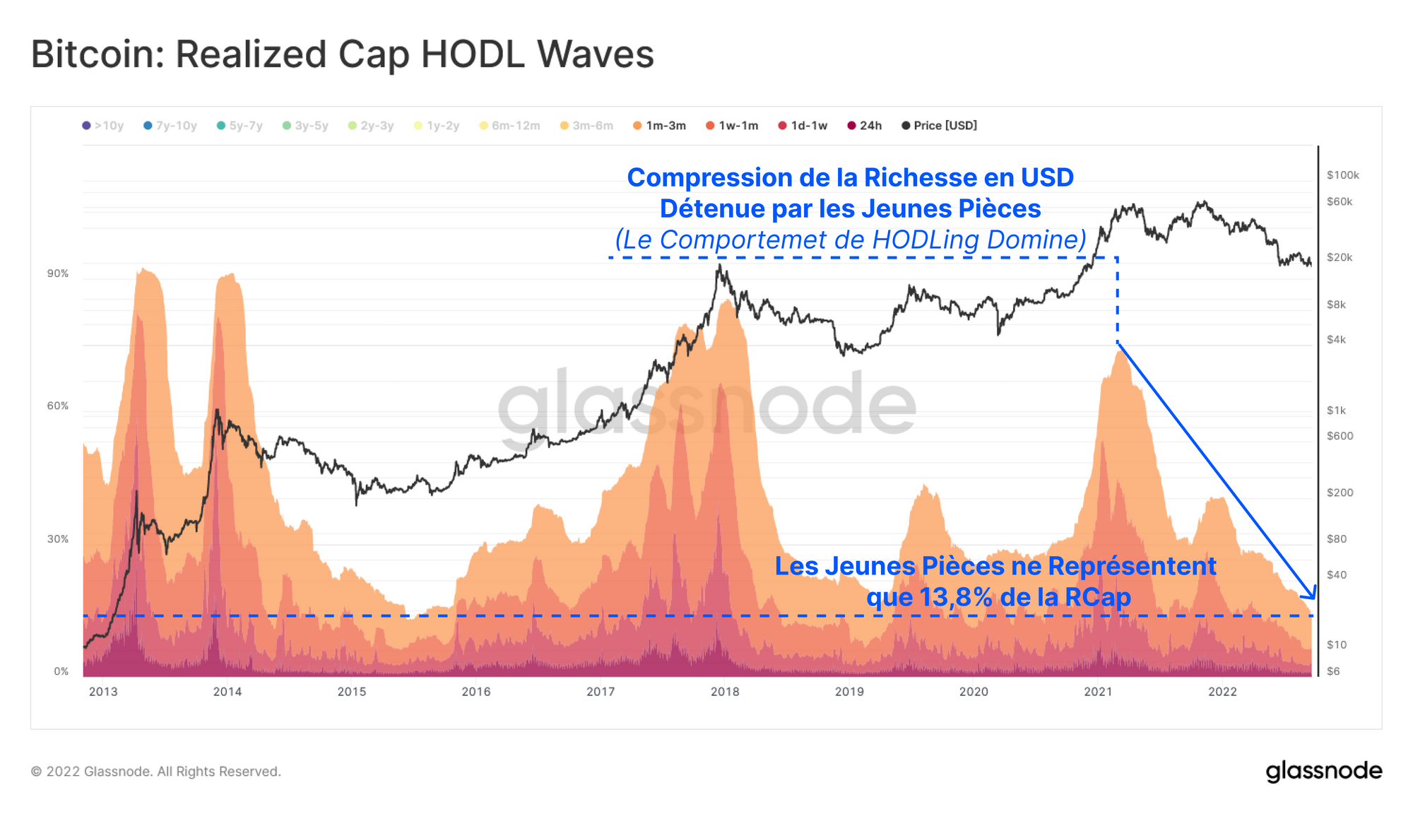 Ce sentiment se retrouve dans la métrique des Vagues HODL de la Capitalisation Réalisée, qui affiche la richesse en USD détenue par les différentes tranches d'âge. Les dépenses des innvestisseurs matures étant fortement réduites, le degré de comportement de HODLing est historiquement élevé.