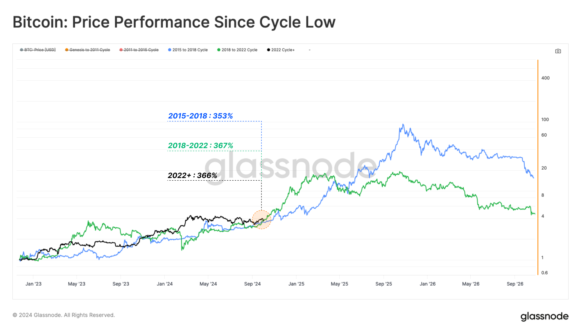 Lorsque nous évaluons l'évolution du cours du BTC depuis ses bas cycliques, une remarquable similitude de performance émerge malgré des conditions de marché extrêmement différentes.