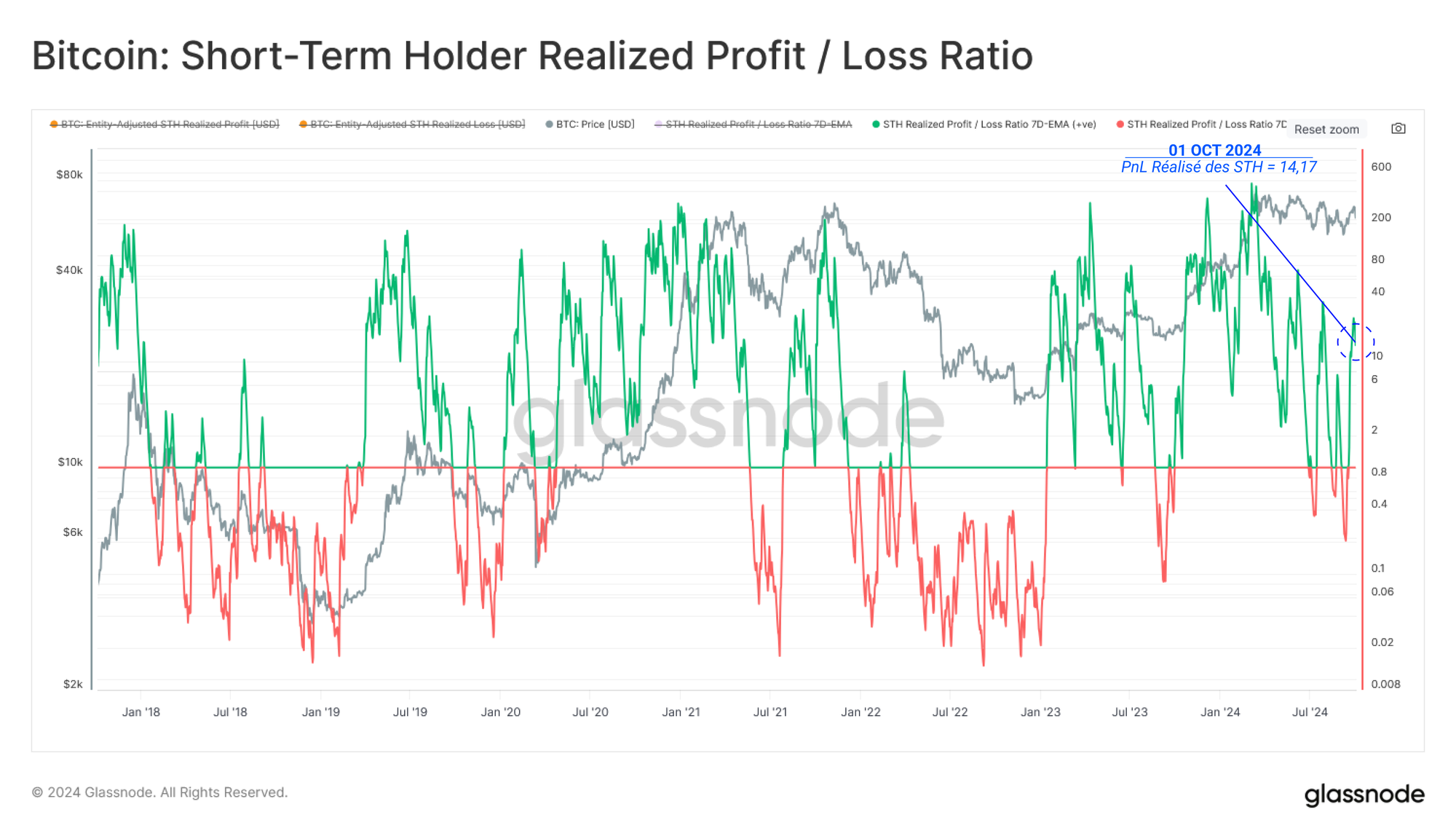 Le ratio profits/pertes réalisés des STH a également fortement rebondi, revenant en territoire positif et enregistrant des volumes de prises de bénéfices 14,17 fois supérieurs à ceux des prises de pertes.