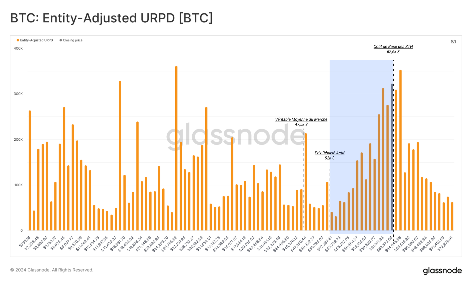 - Le positionnement des détenteurs à court terme (STH) et leur comportement de dépense se sont largement améliorés alors que le prix spot tente de récupérer le coût de base des STH à 62 500 dollars.