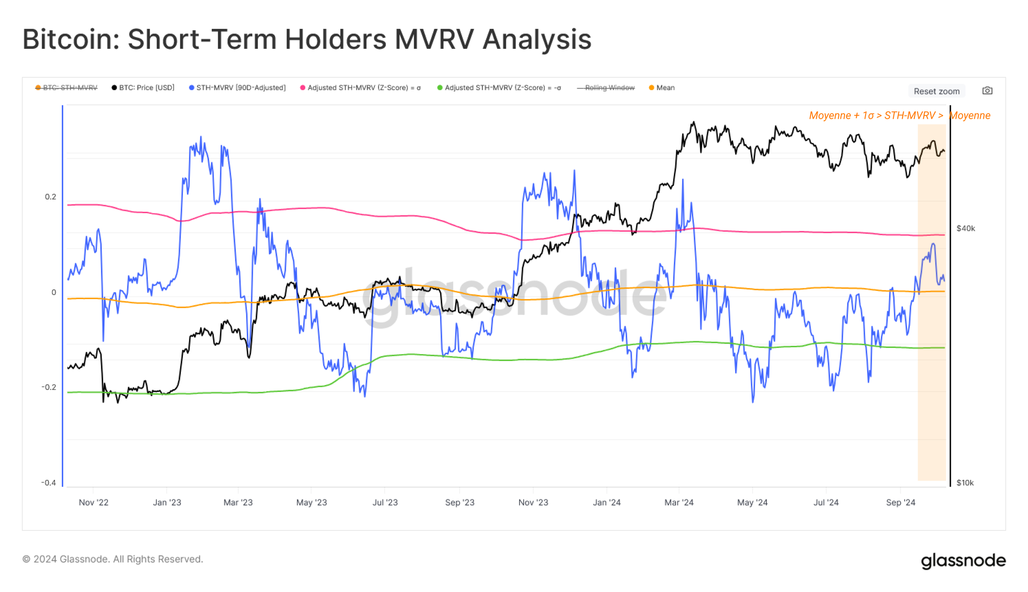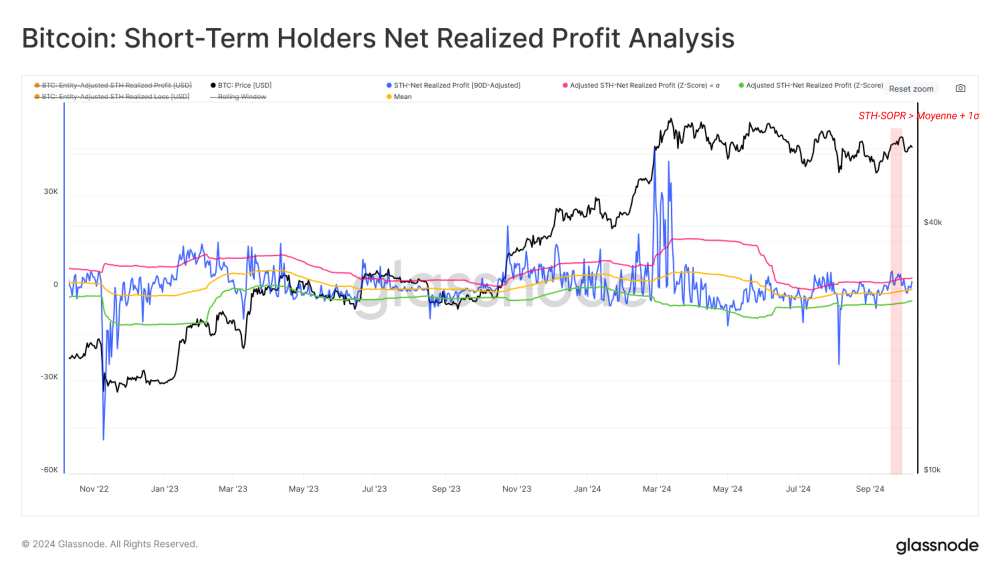 Le ratio d'Offre en Profit / Perte et le STH-MVRV atteignant tous deux leurs bandes statistiques supérieures respectives, nous pouvons théoriser que les nouveaux investisseurs ont une incitation décente à réaliser leurs profits.