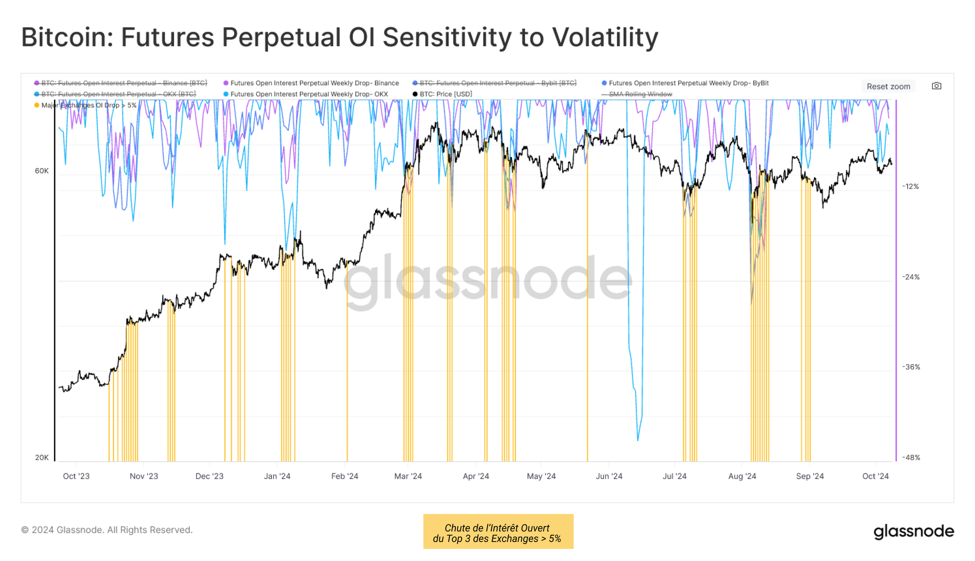 Toutefois, le pourcentage de réduction de l'intérêt ouvert observé sur les trois principales plateformes de contrats perpétuels n'a pas dépassé le seuil de 5 % 🟨.