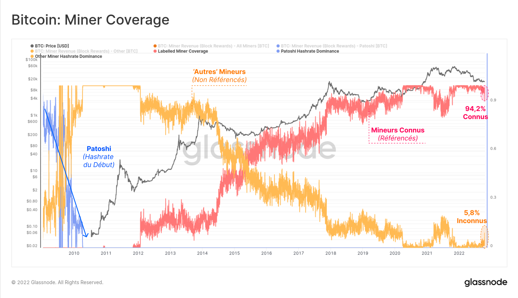 Dans l'ère post-mars 2020, nos mineurs étiquetés 🔴 couvrent plus de 95 % du hashrate du réseau (surtout depuis la grande migration de mai 2021). Les mineurs inconnus étiquetés comme "Autres" 🟡 représentent les 5% restants.