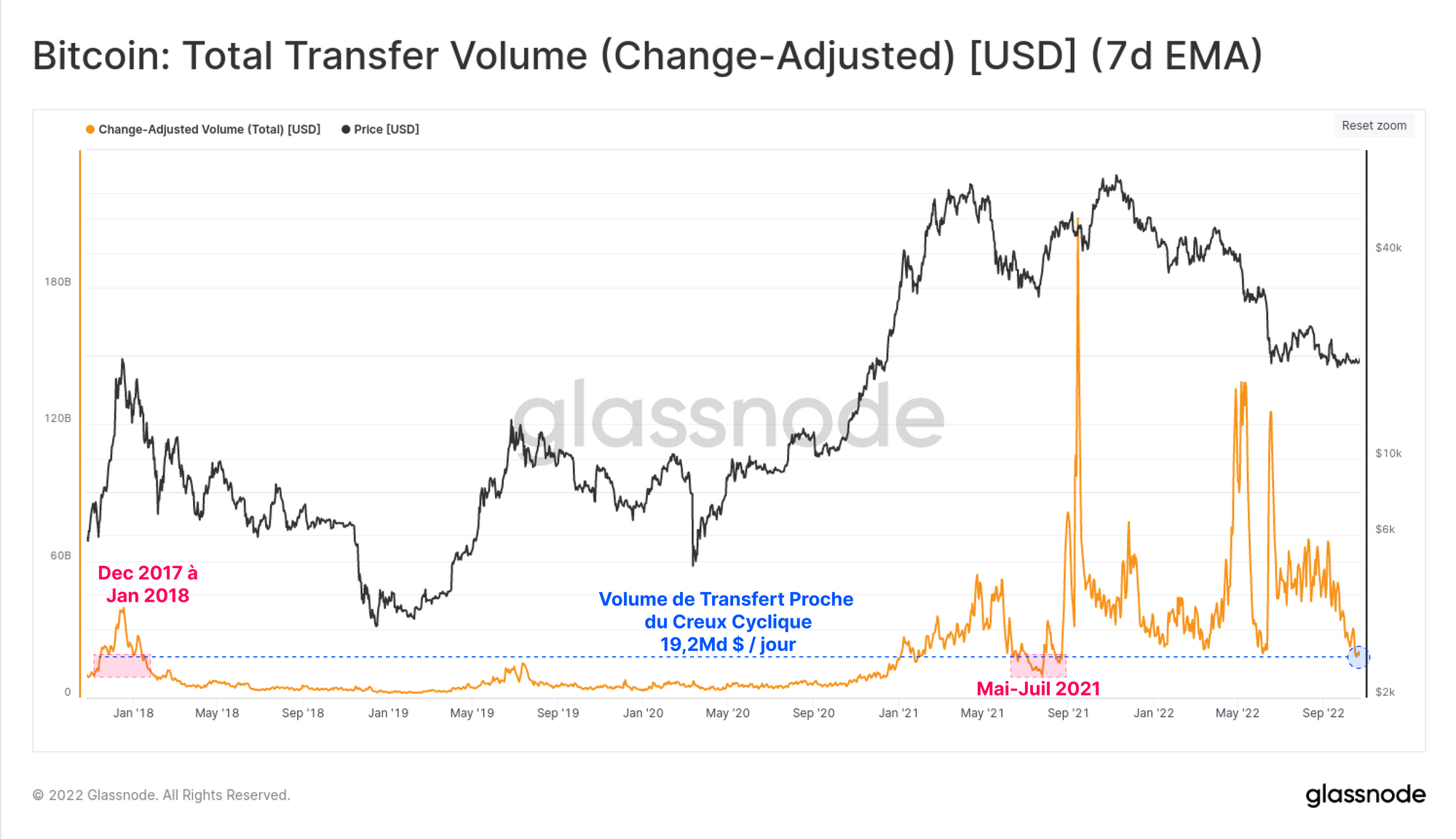 Le volume de transfert (USD) s'est également effondré vers le bas du cycle, tombant à 19,2 milliards de dollars par jour. Ce chiffre est désormais inférieur au pic de volume de transfert observé en décembre 2017, et n'est que légèrement supérieur aux points bas de mai à juillet 2021.