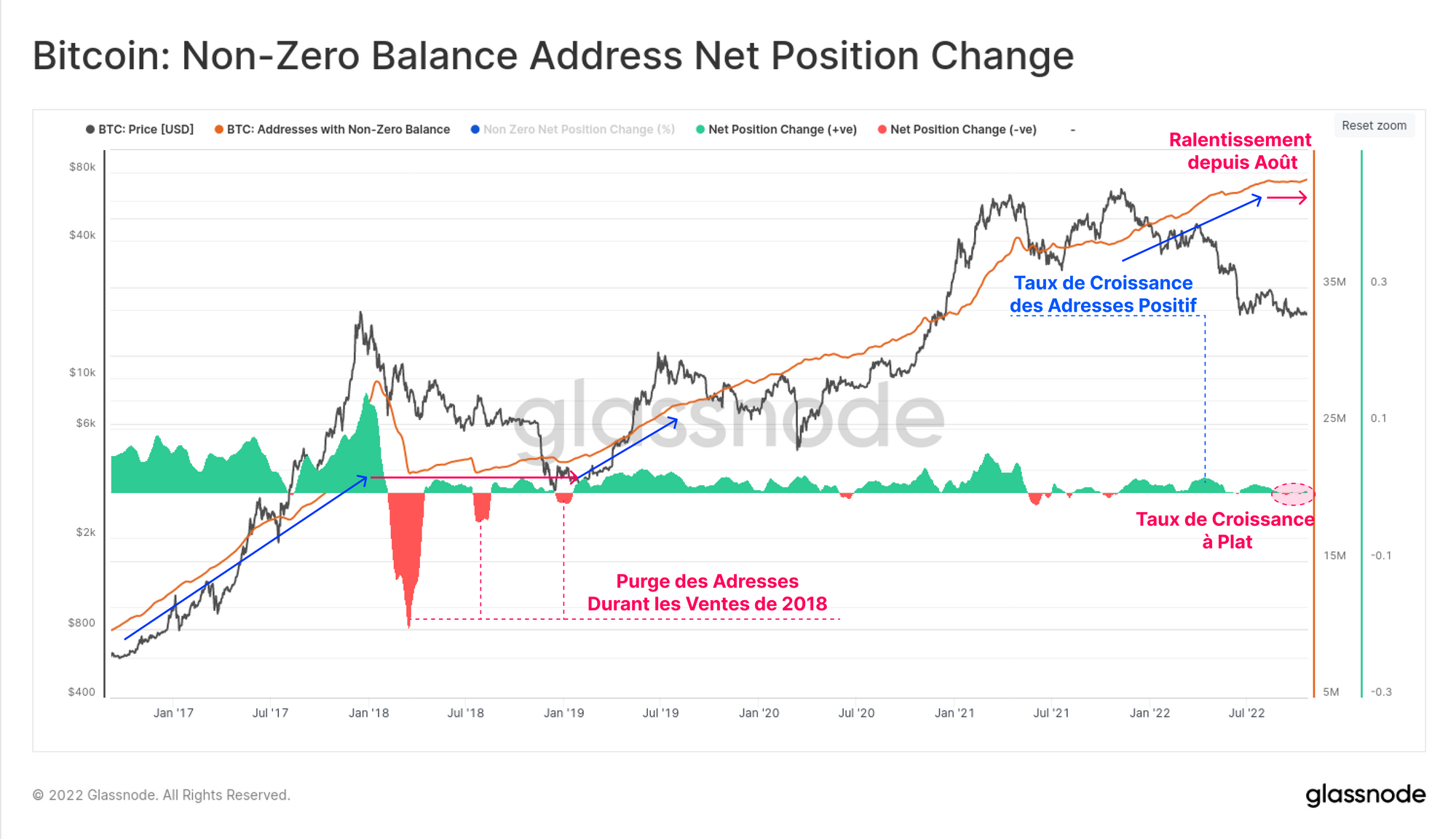 Le taux de croissance des adresses ayant un solde non nul stagne également depuis août, ce qui est également similaire à la période de novembre 2018. Cela indique que malgré les quelques 400k nouvelles adresses par jour, il y en a autant qui se vident de tout leur solde.