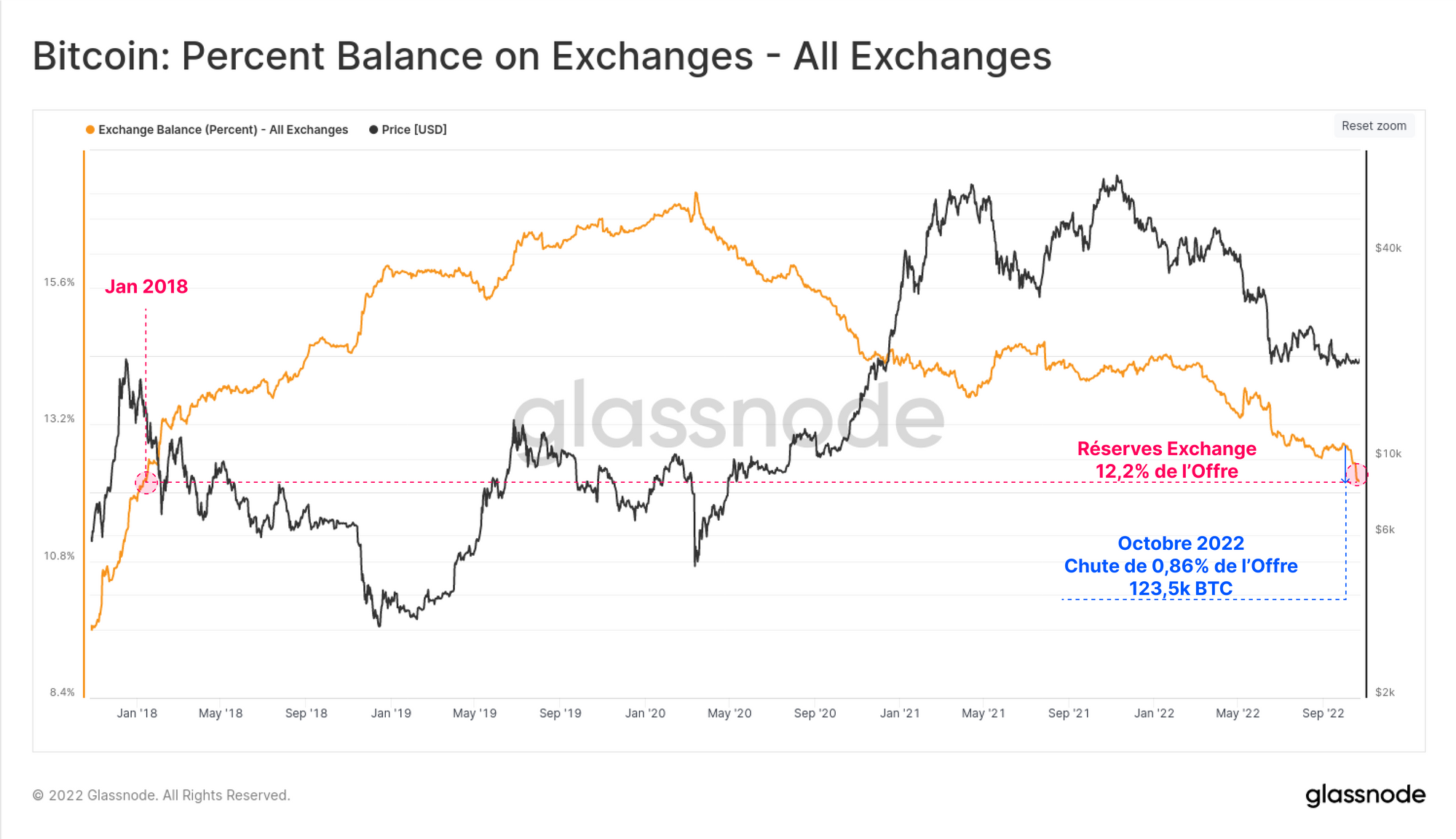 Les réserves détenues sur les exchanges ont également poursuivi leur déclin incessant, tombant à des plus bas niveaux pluriannuels tout au long du mois d'octobre et revenant aux niveaux de janvier 2018.