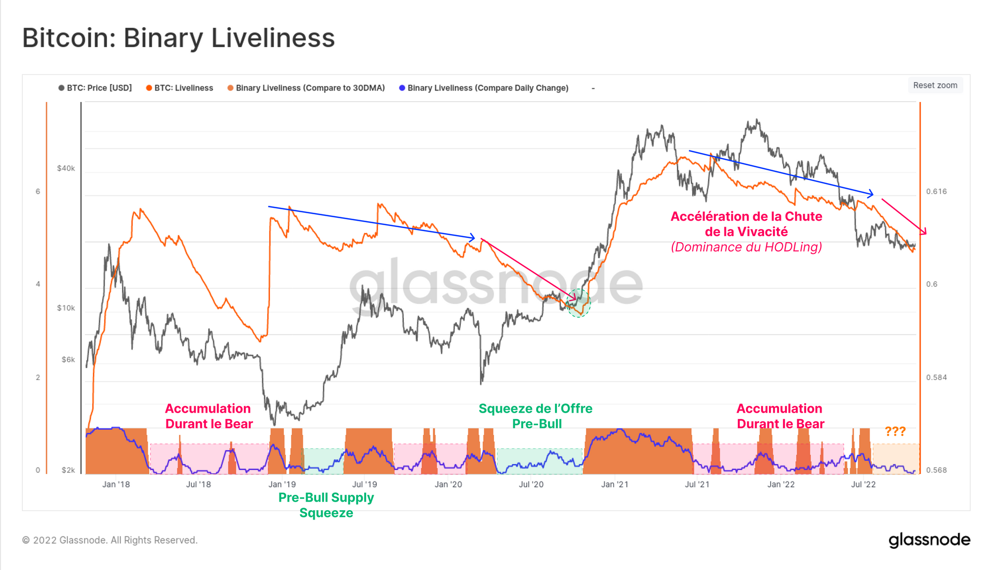 - Le déclin de la vivacité s'accélère, ce qui indique que le marché est très fortement aligné sur un comportement de type HODLing. Les anciennes mains ne dépensent tout simplement pas.