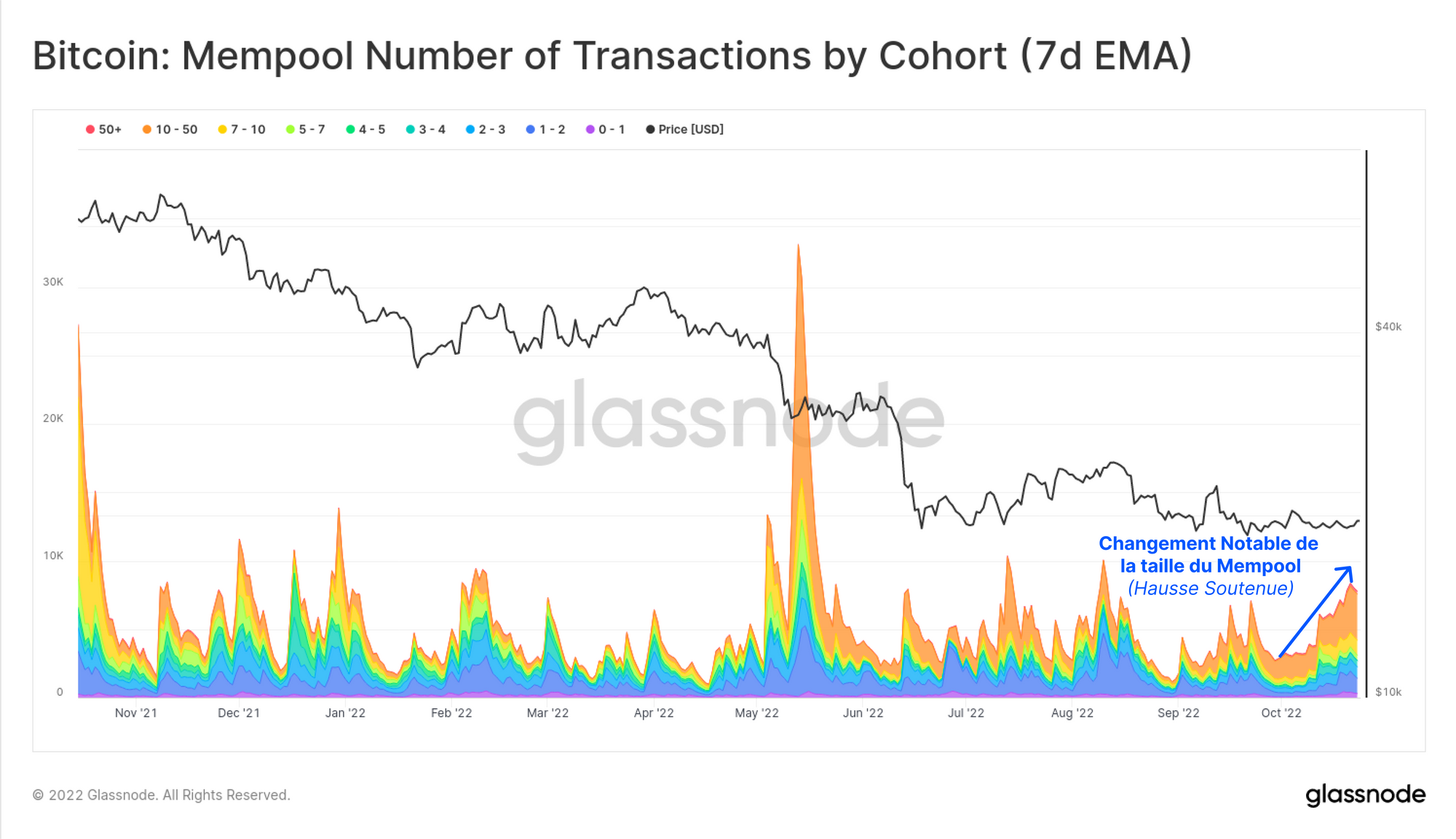 Il faut noter cependant un changement de caractère récent observable dans le mempool. Le volume de pièces transférées dans des transactions touchant le pool de mémoire des nœuds Bitcoin a connu une augmentation soutenue depuis septembre.