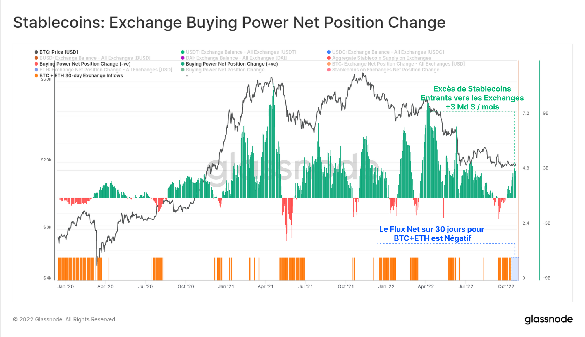 Actuellement, nous pouvons constater que le flux net de BTC et ETH sur 30 jours a été constitué de retraits, et simultanément, un excès de 3 milliards de dollars/mois en pièces stables a afflué dans les échanges, augmentant le pouvoir d'achat relatif.