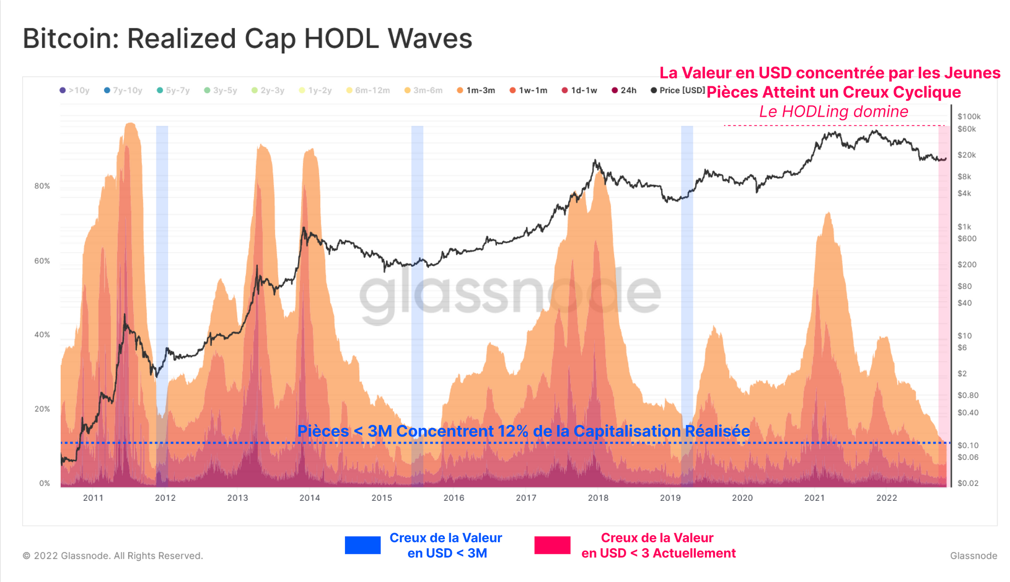 Après la vente provoquée par l'effondrement de LUNA-UST, la présence d'investisseurs de petite taille a été en équilibre avec le Capitalisation Réalisée, ce qui suggère qu'une désintoxication des investisseurs spéculatifs à faible conviction a eu lieu. La composante de la durée semble toutefois absente du régime actuel par rapport au précédent de 2019.