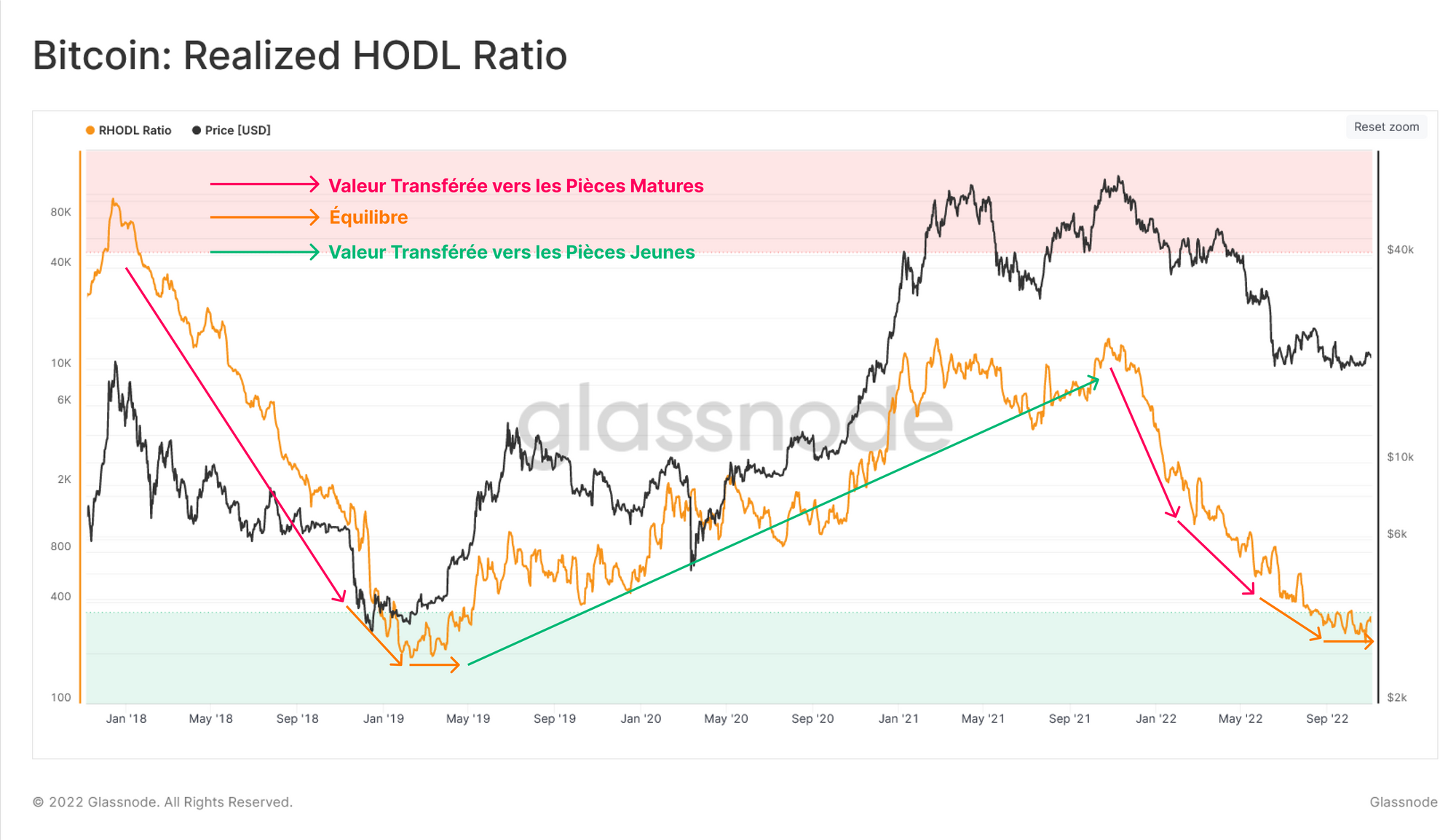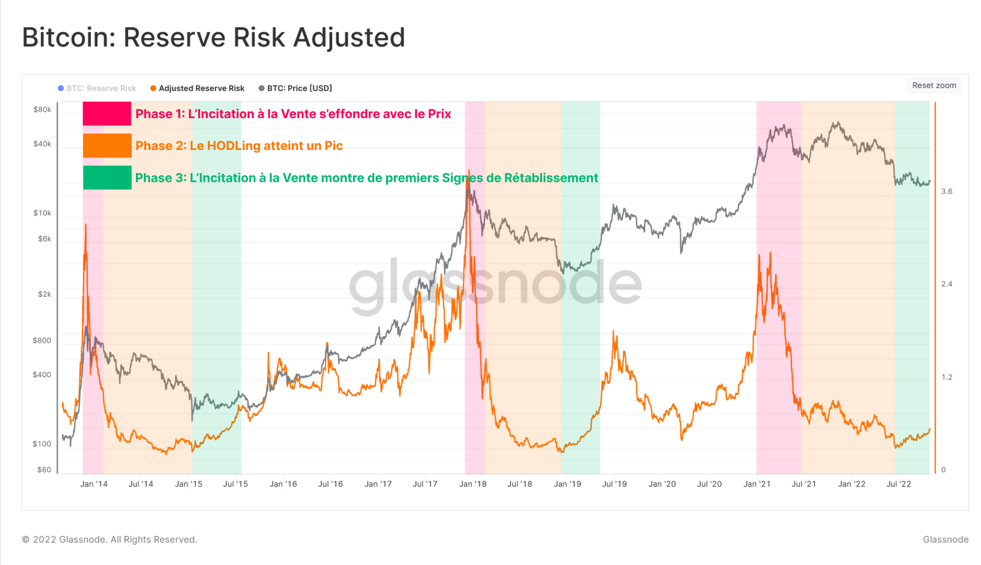 - Les tendances à la baisse du risque de réserve ajusté indiquent que l'opportunité perçue d'achat augmente et que le HODLing devient le mécanisme dominant du marché.