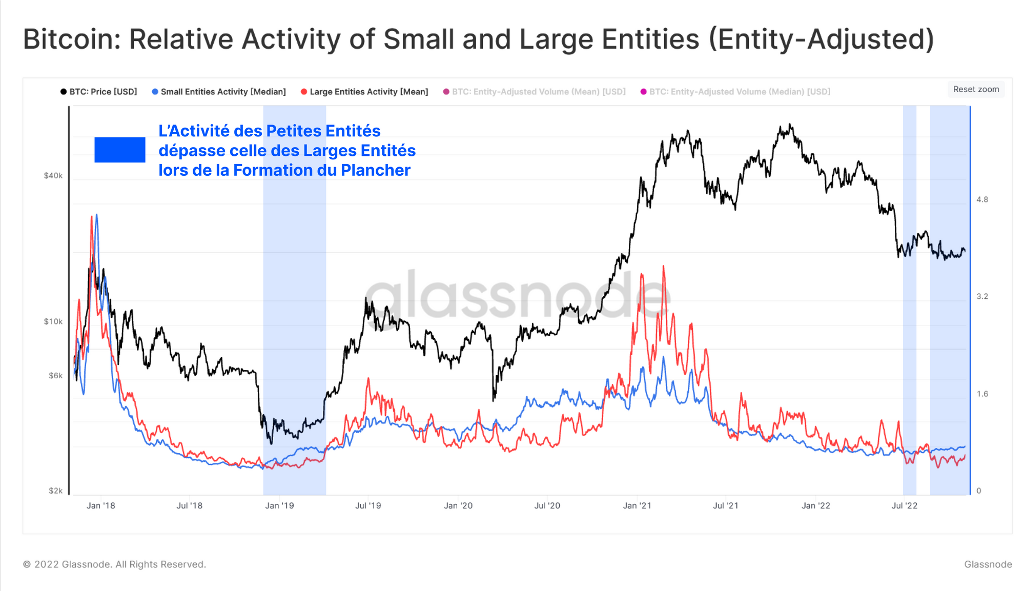 Une fois de plus, nous pouvons mettre en évidence la similitude de structure entre l'activité des petites et des grandes entités pendant le creux de 2018. Après la capitulation finale de l'action des prix, l'activité des petites entités a augmenté et a effectivement fait front aux impulsions haussières de 2019 et 2020, suggérant un afflux de transactions de petite taille, et donc un premier signe de retour de la demande.