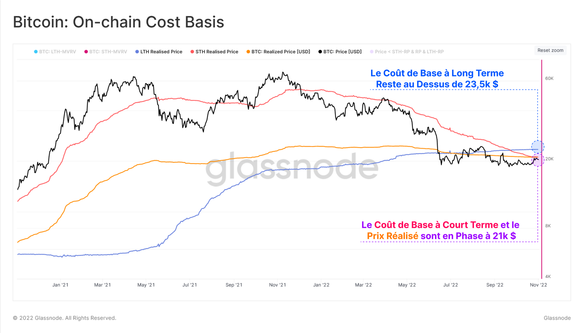 - Le coût de base des détenteurs à court terme 🔴 et le prix réalisé 🟠 se négocient approximativement au même niveau de 21,1 000 $, que le marché conteste actuellement.