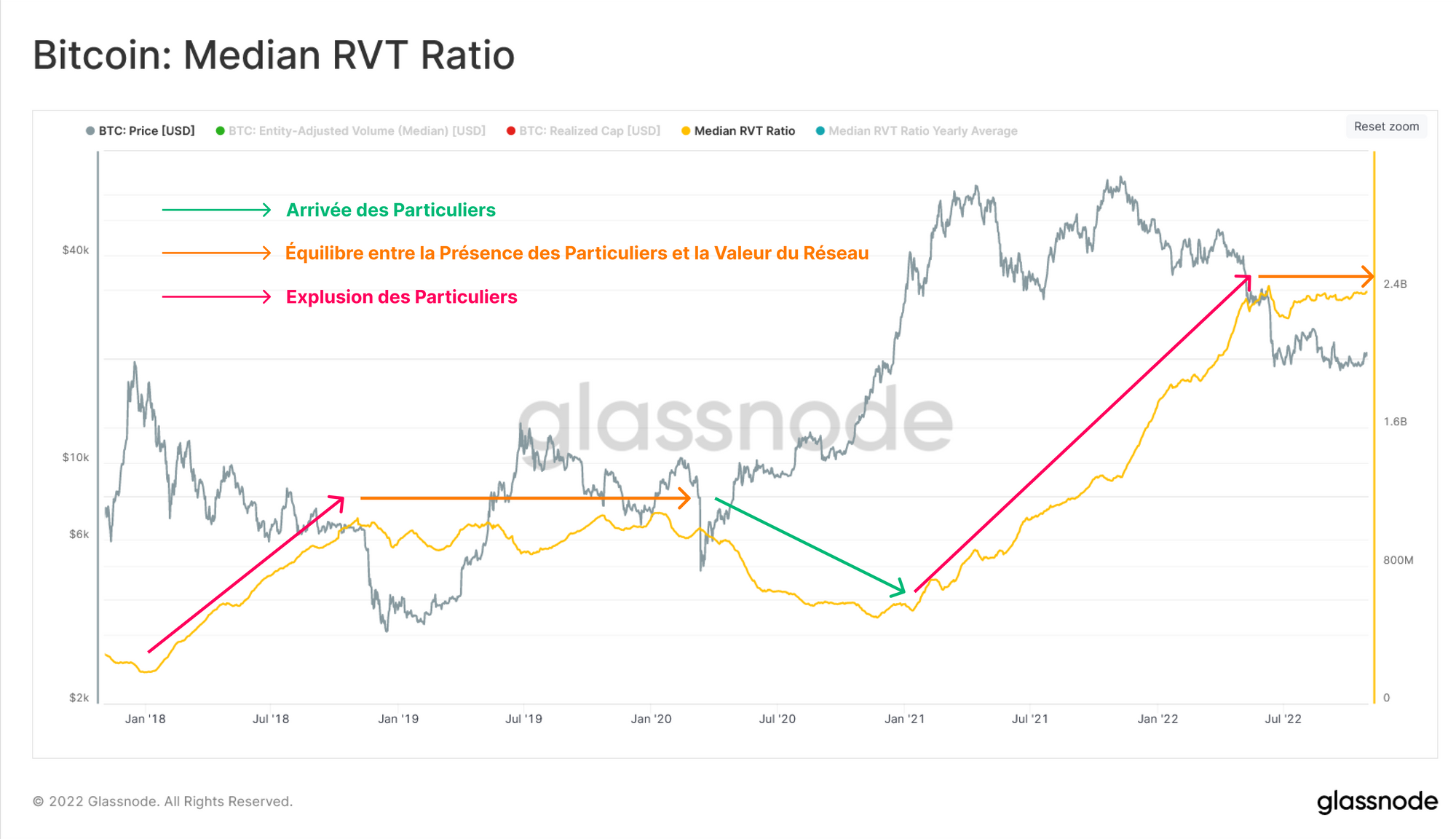 - Un ratio RVT médian stable se produit lorsque la participation des particuliers et la valorisation du réseau sont constantes, ce qui indique un équilibre dans l'utilisation du réseau. Historiquement, cette situation a été associée à des périodes de transition à l'échelle macro.