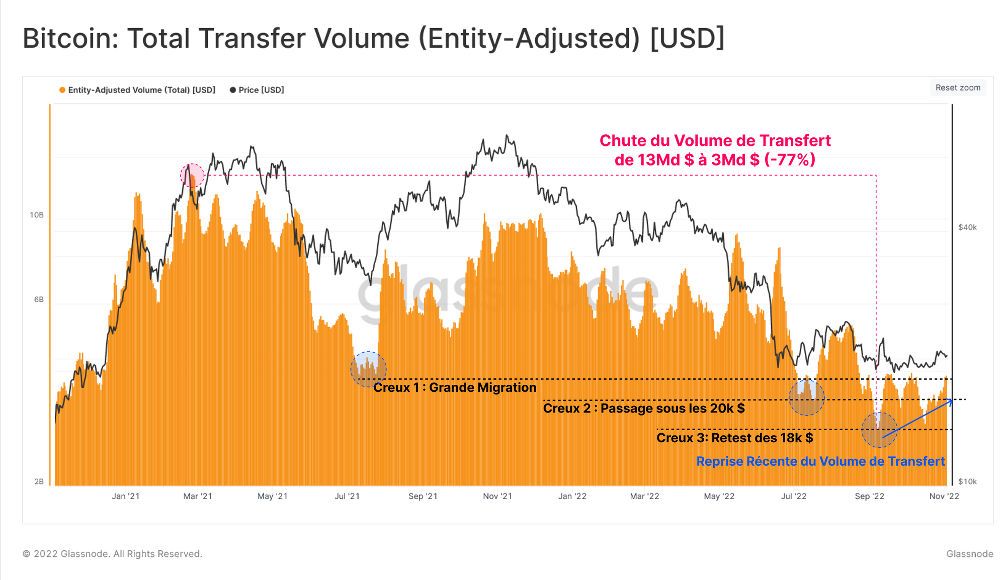 Si l'on analyse le volume de transfert réglé par le réseau Bitcoin sur un jour donné, on constate une baisse substantielle depuis le pic de 13 milliards de dollars par jour pendant le sommet de janvier à mai 2021, jusqu'à un creux de cycle d'un peu moins de 3 milliards de dollars par jour aujourd'hui, soit une baisse de 77 %.