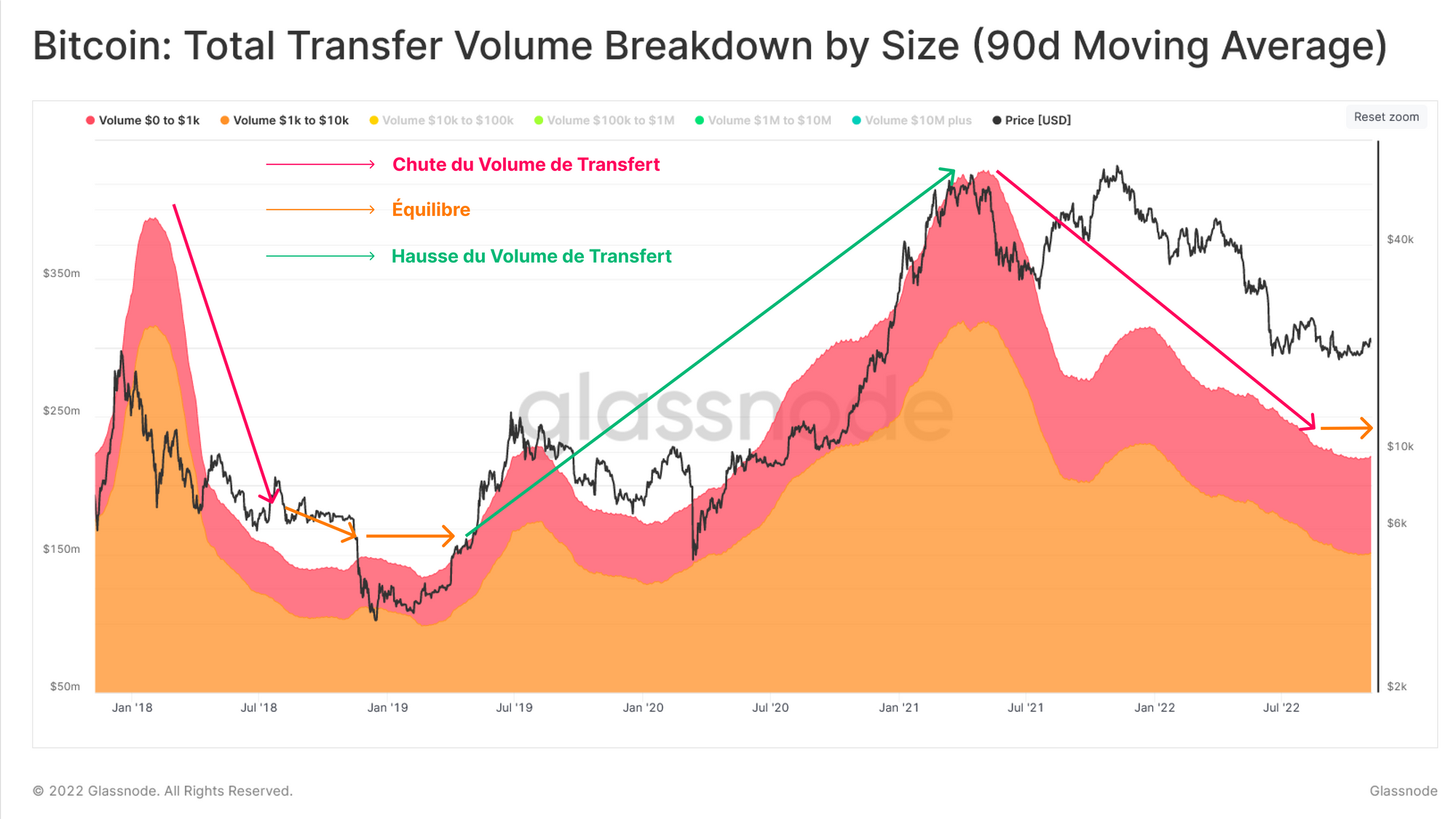 Les transactions de 0 à 10k $ ont connu un déclin brutal, passant de 430 milliards de dollars par jour en janvier 2021 à 220 milliards de dollars par jour actuellement, soit une baisse de 49 %.