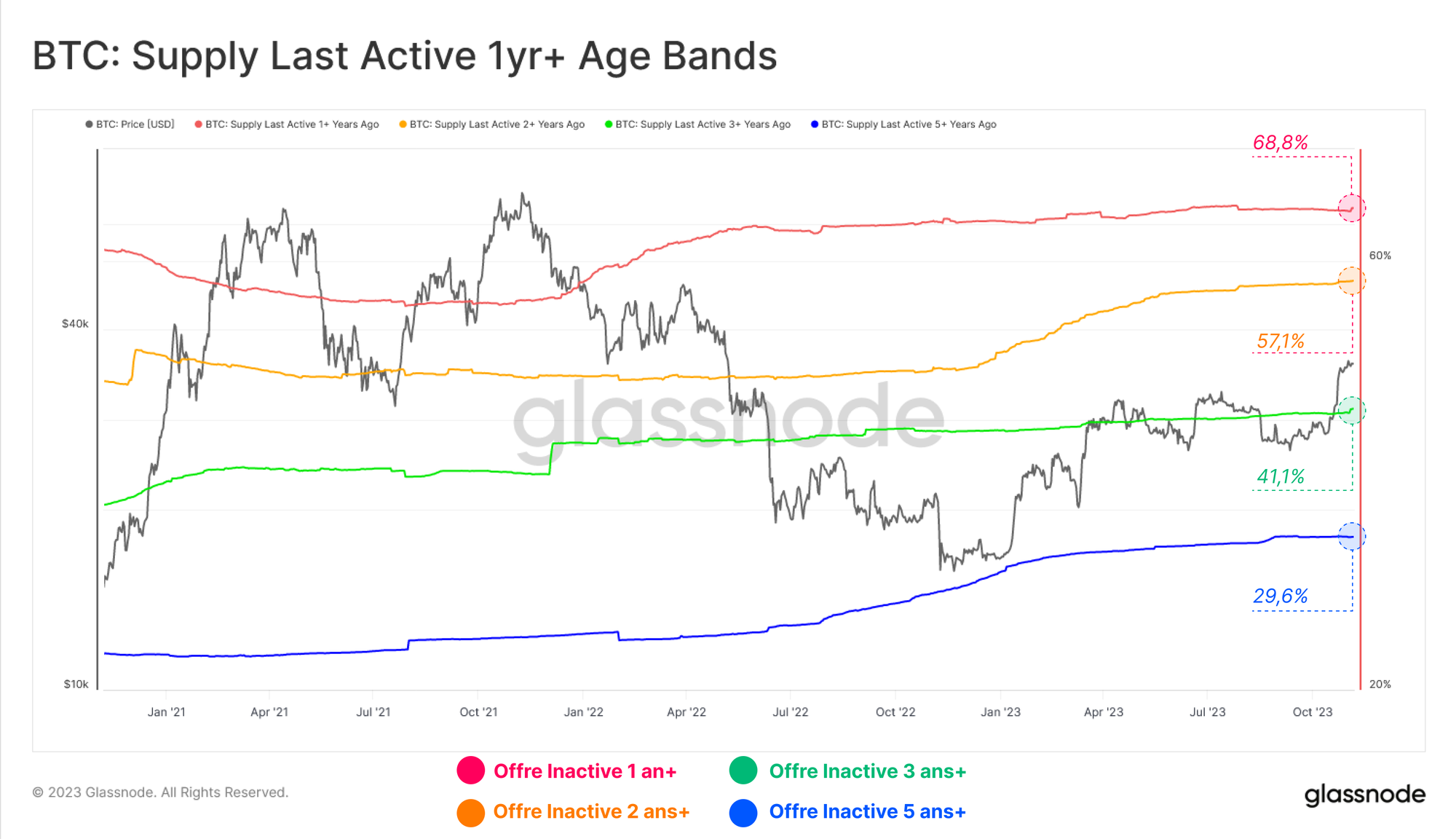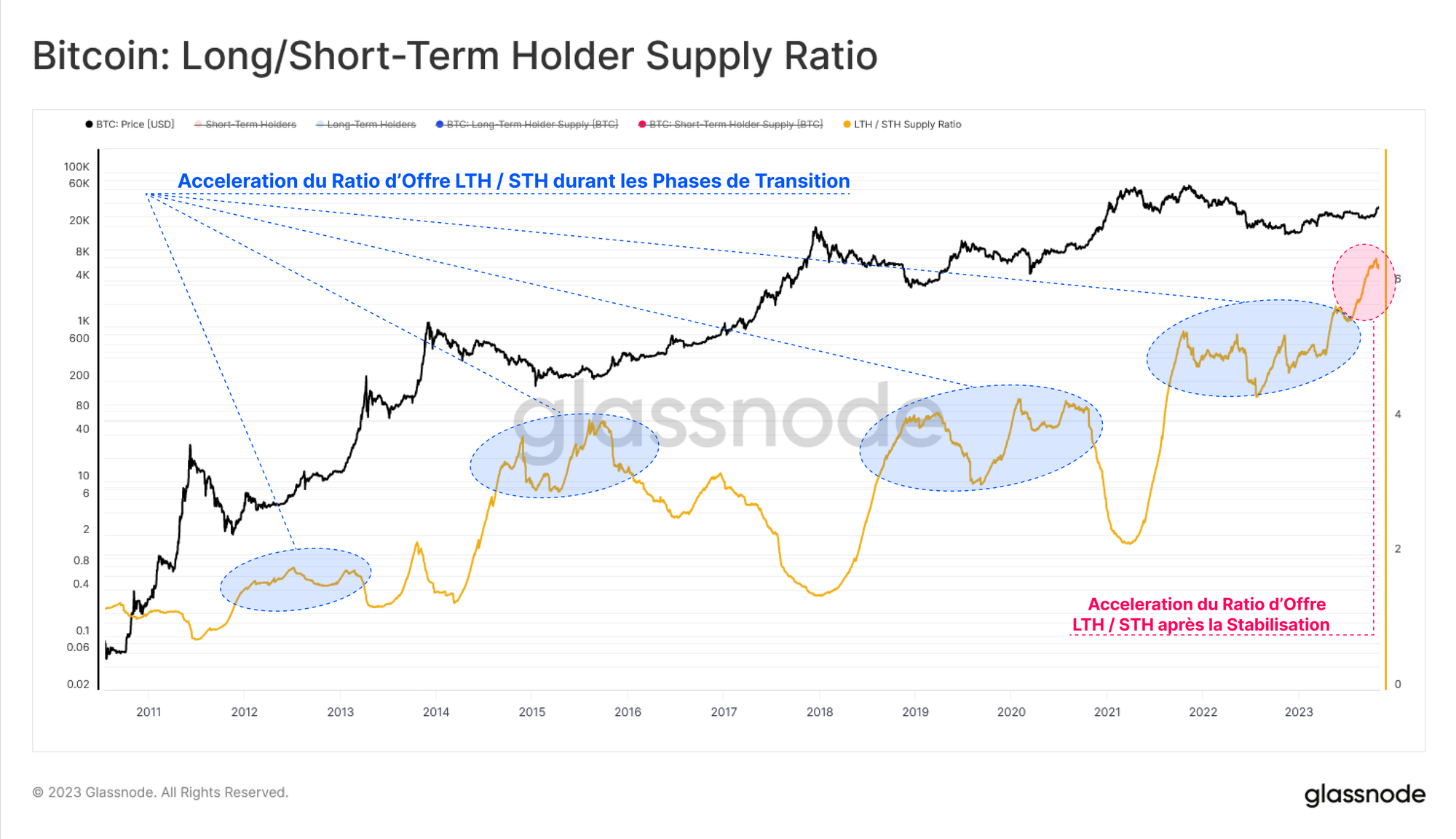Si l'on prend le ratio entre l'offre des détenteurs à long terme et à court terme, on constate qu'il a atteint de nouveaux sommets depuis juillet 2023. Cela montre clairement l'ampleur de la divergence entre l'offre dormante et l'offre mobile.