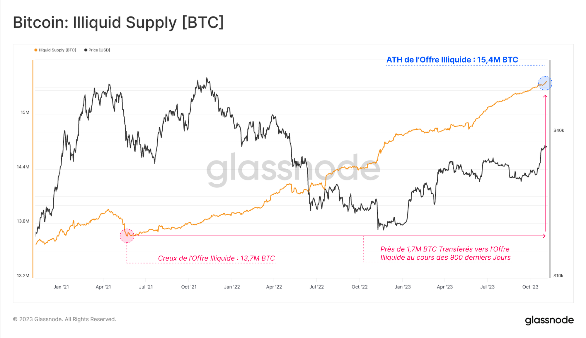 La métrique de l'offre illiquide, qui mesure la quantité d'offre détenue dans les portefeuilles avec un historique minimal de dépenses, est également à un ATH de 15,4 millions de BTC.