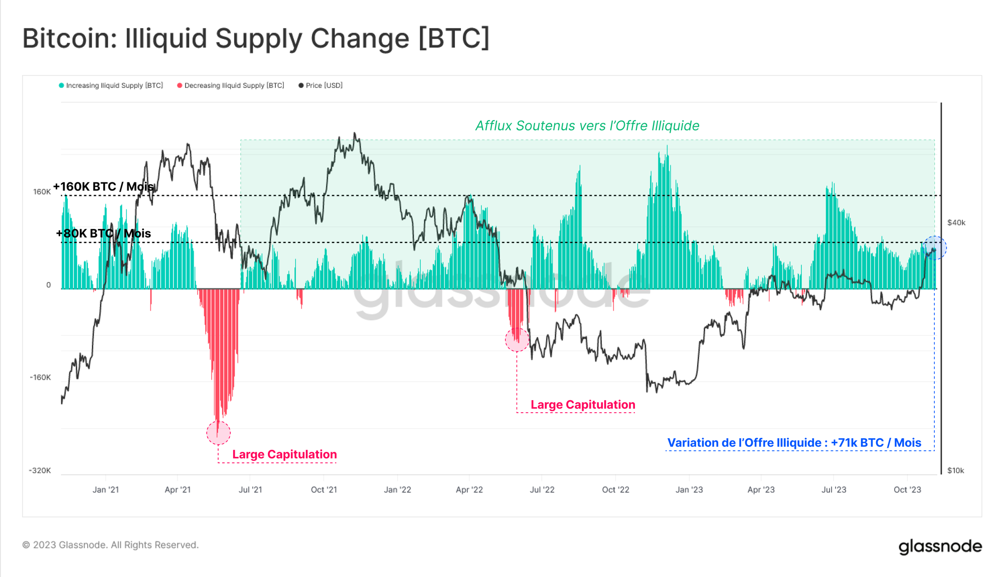 Cela se reflète dans le taux de variation mensuel de l'offre illiquide, qui se situe dans une période pluriannuelle de hausse nette, augmentant actuellement à un taux de +71 000 BTC par mois.