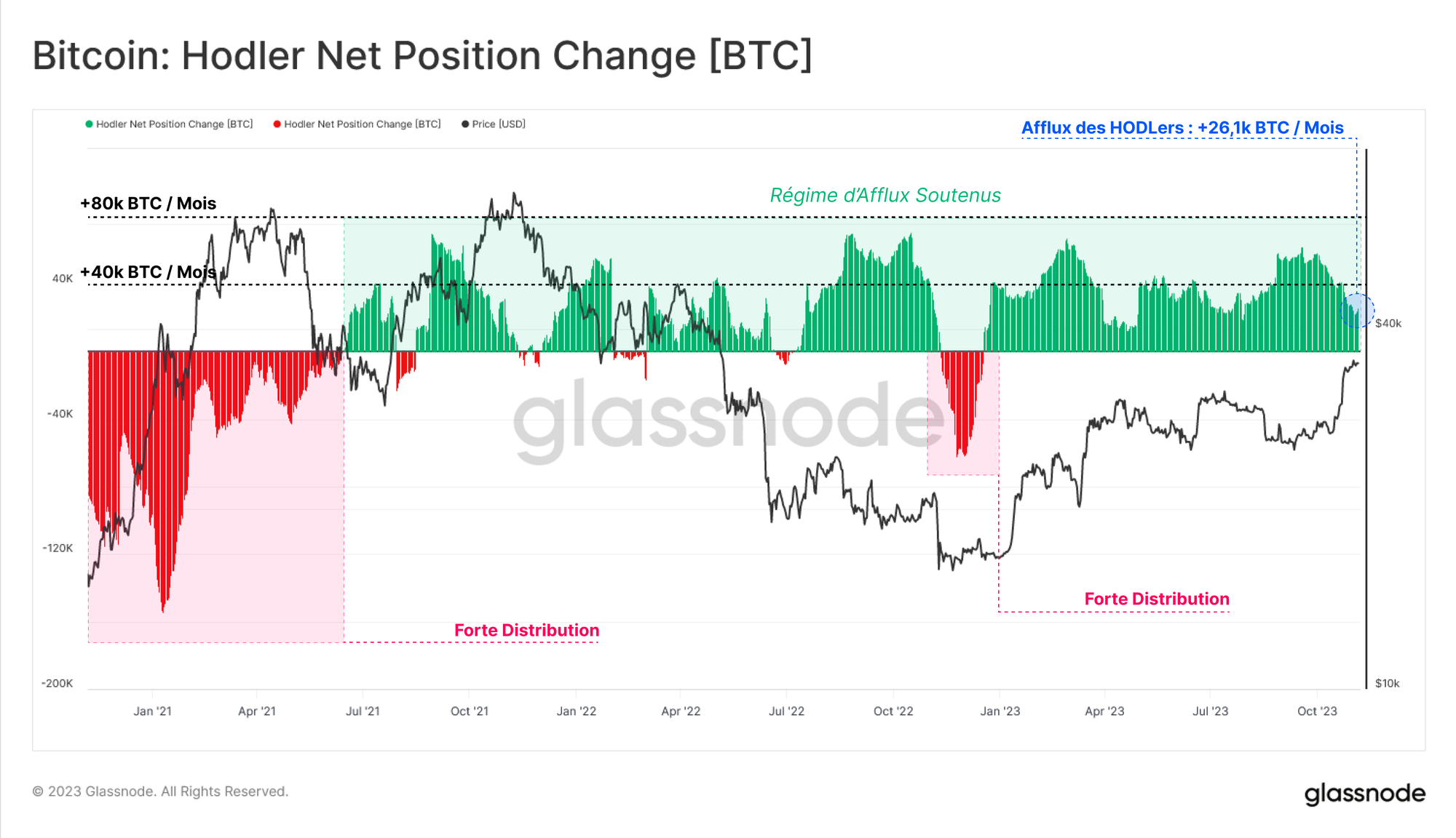 Ce processus est illustré par la baisse importante de leur offre au cours du cycle haussier de 2021, qui s'accompagne d'une hausse de l'offre des LTH, ainsi que des volumes d'entrée sur les exchanges.