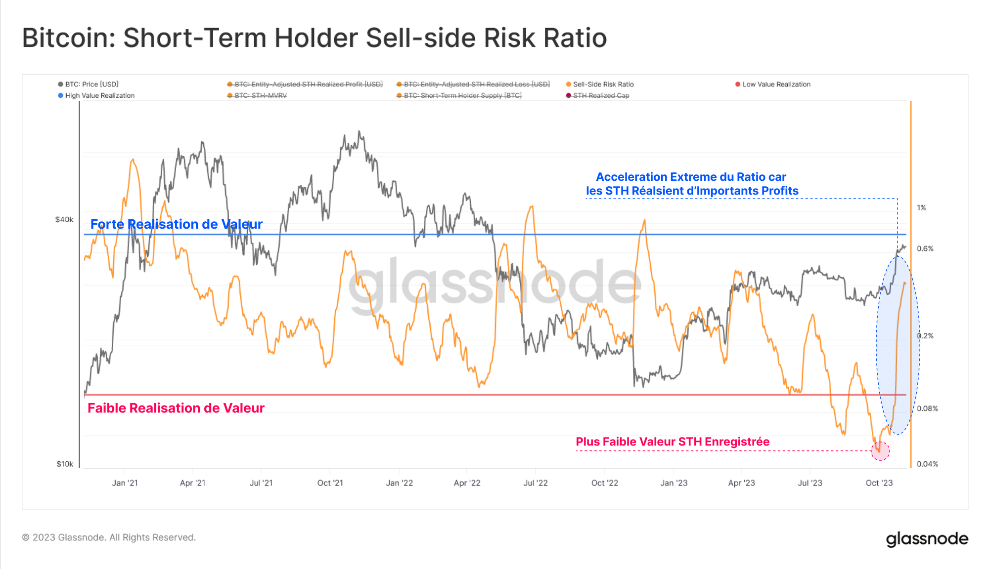 L'augmentation du ratio de risque de vente des STH par rapport à la période précédente correspond à l'événement de prise de bénéfices qui a transféré des pièces à de nouveaux investisseurs dans la fourchette de prix actuelle.