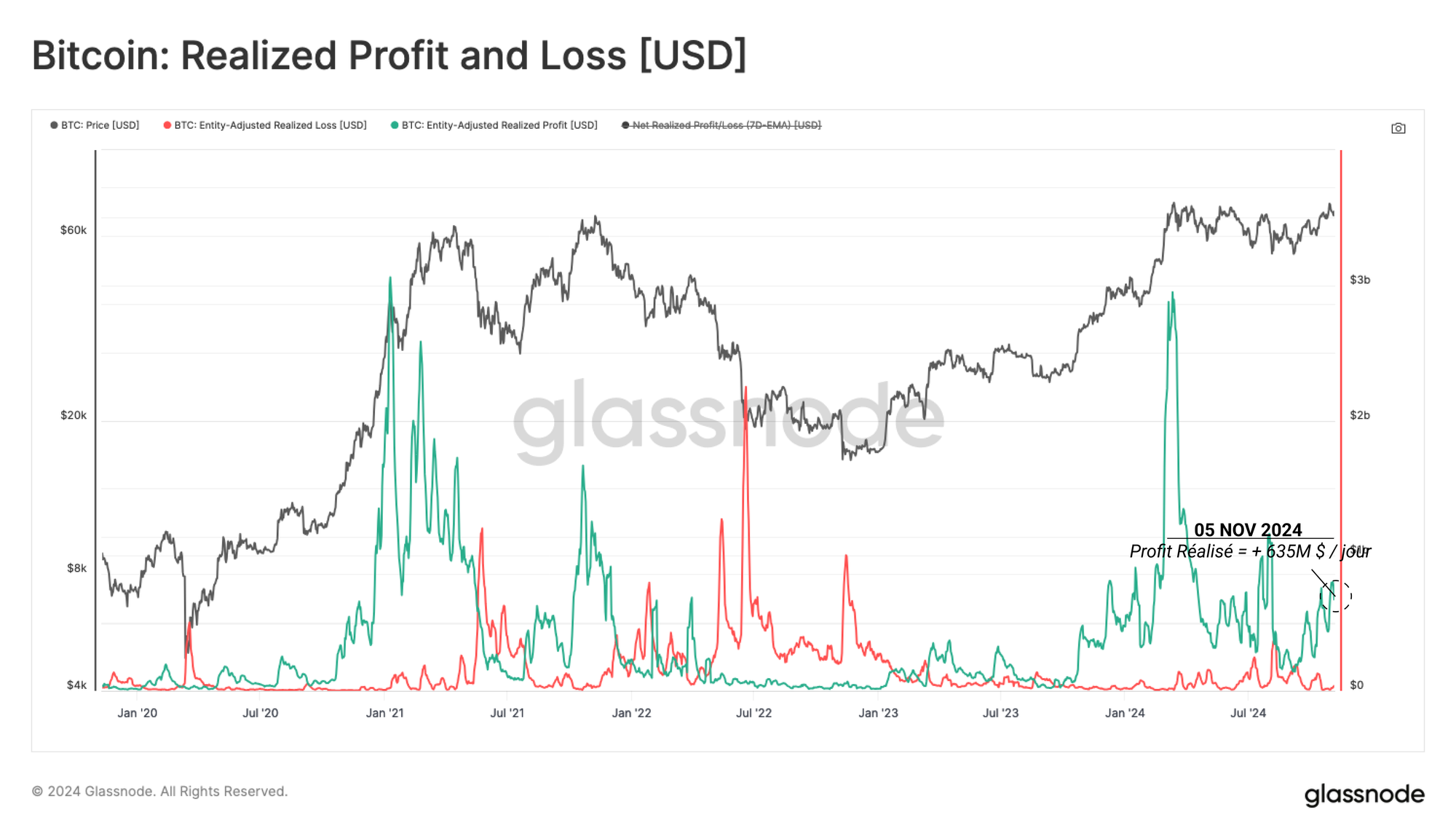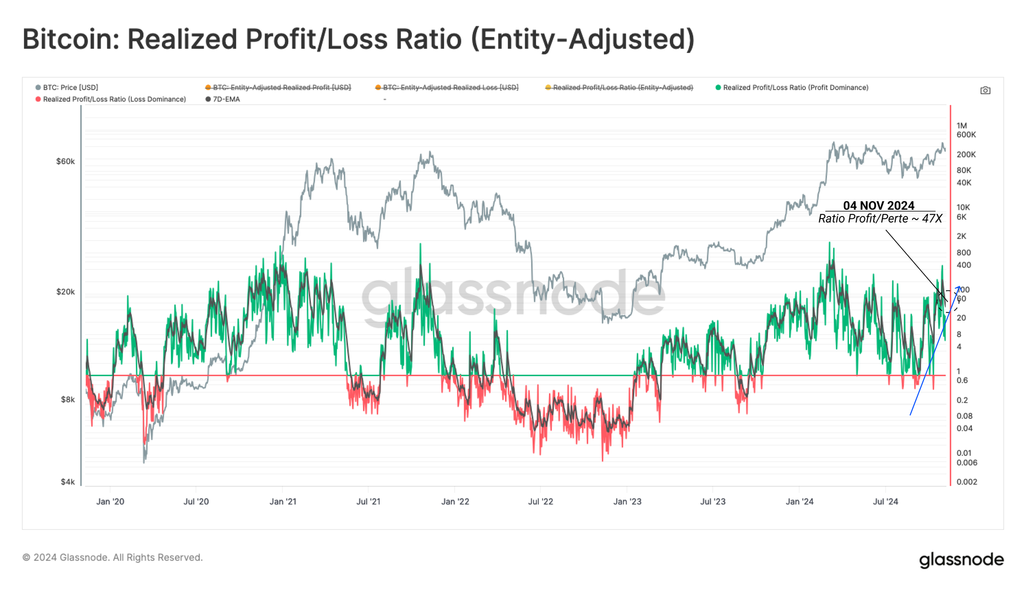 Le marché se trouve actuellement dans un régime à dominance de profits, le volume de profits réalisés étant ~47x plus grand que les pertes.