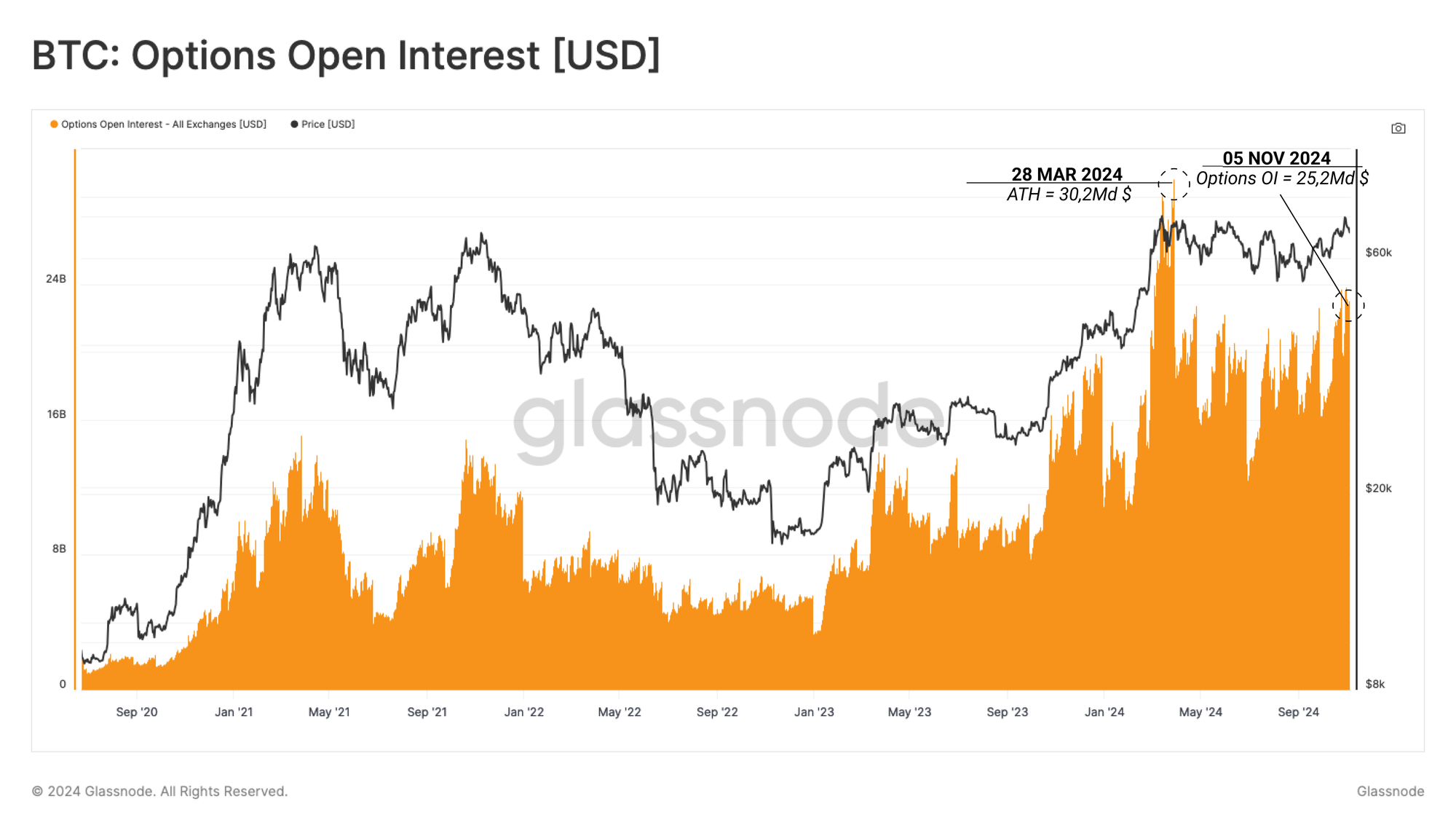 Le montant de l'intérêt ouvert déployé dans les contrats options a bondi pour atteindre une valeur de 25,2 milliards de dollars, seule l'ATH de mars enregistrant une valeur plus élevée de 30,2 milliards de dollars.