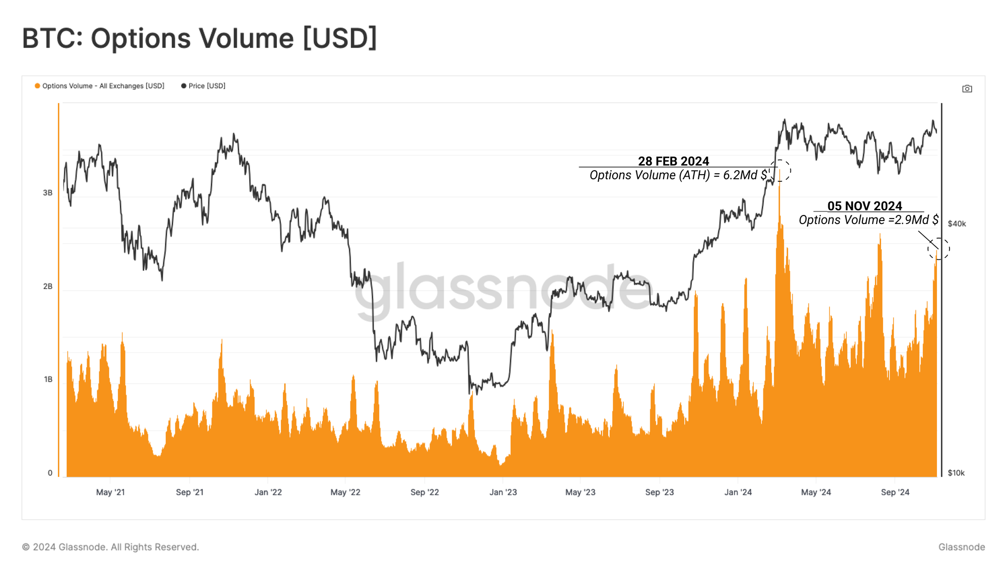 Le volume des transactions options augmente également, atteignant désormais une valeur de 2,9 milliards de dollars, qui n'est dépassée que par le volume des transactions de l'ATH de mars et pendant le dénouement du yen carry trade du 5 août.