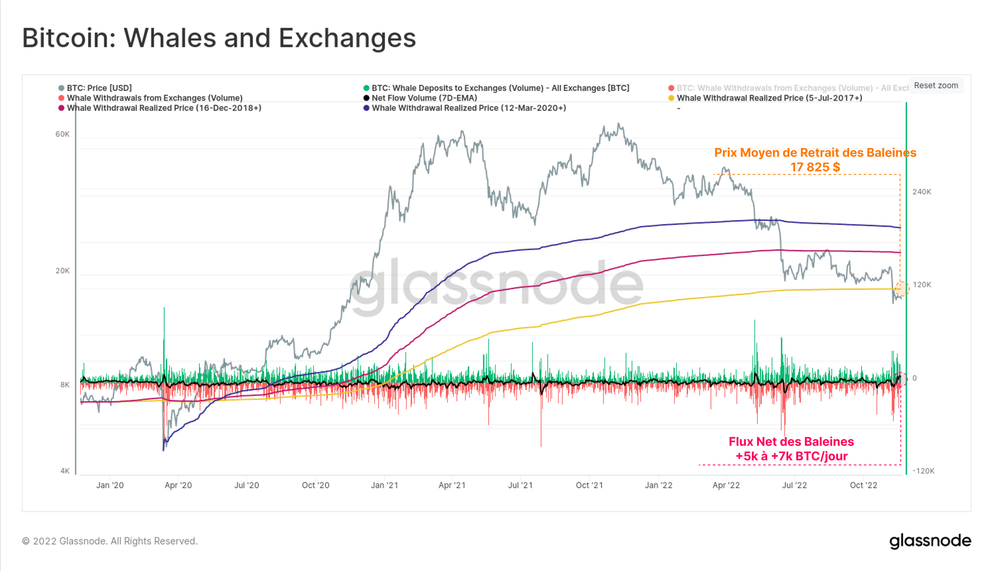 La position financière des baleines (entités > 1k BTC) peut en être un facteur déterminant. La trace jaune ci-dessous montre le prix moyen de retrait de la cohorte des Baleines depuis le 5 juillet 2017 (lancement de Binance), qui se situe actuelleement à 17 825 $.