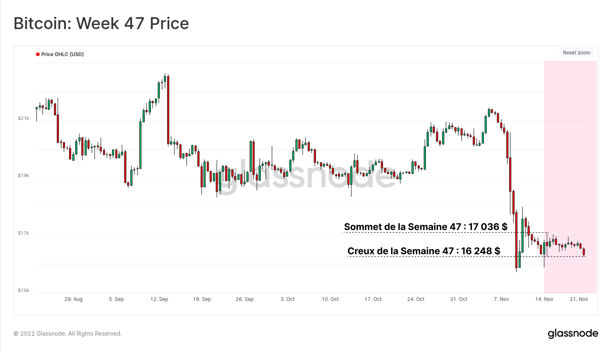 Le marché continue de consolider cette semaine, mais a baissé depuis le sommet de 17 036 $ atteint en début de semaine, pour clôturer à 16 248 $, l'un des prix de clôture les plus bas du cycle actuel.