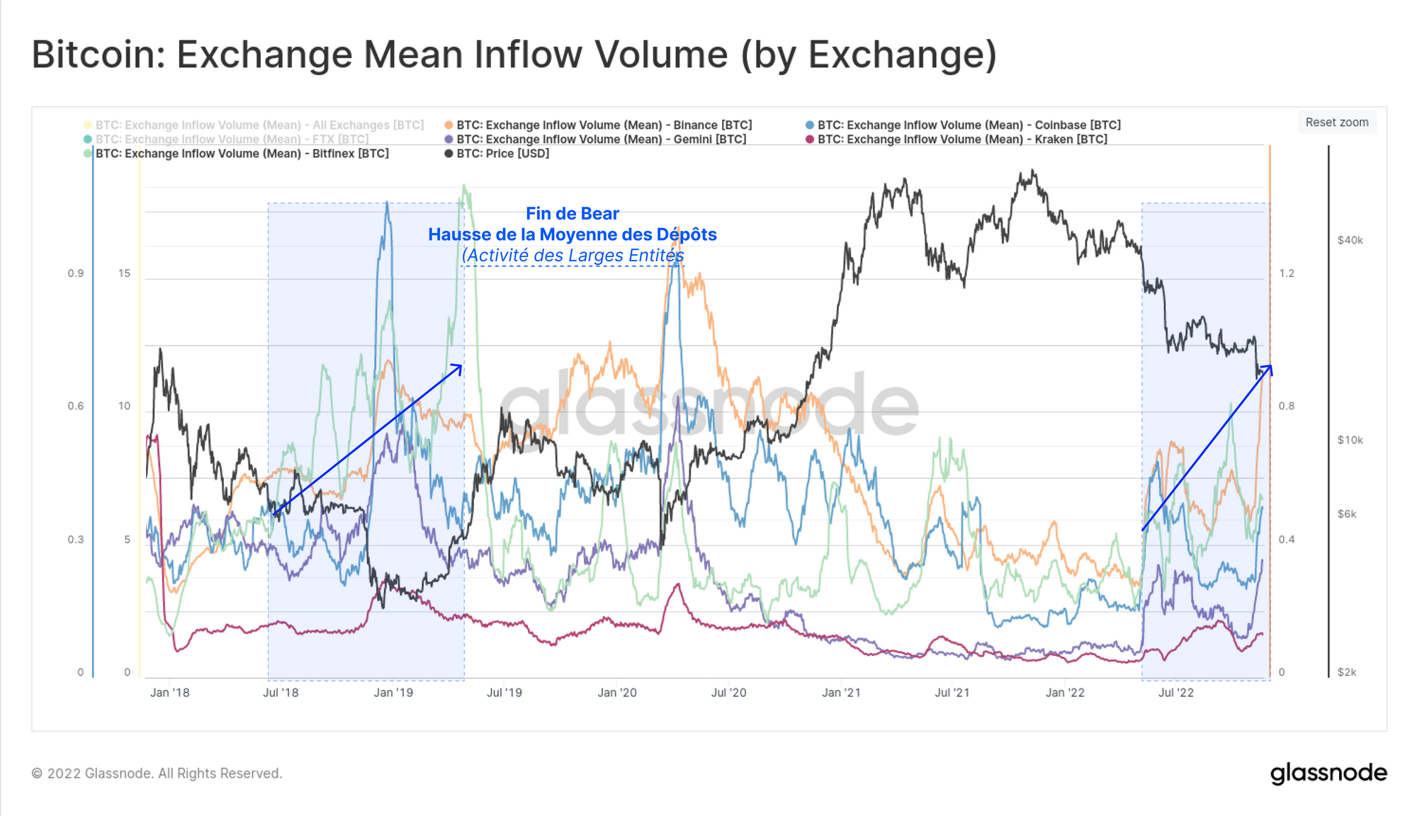 En d'autres termes, la taille moyenne des dépôts sur l'ensemble des principaux exchanges augmente en USD alors que le marché forme un plancher. Ce phénomène est présent sur les principaux exchanges, notamment Binance, Bitfinex, Coinbase, Gemini et Kraken.
