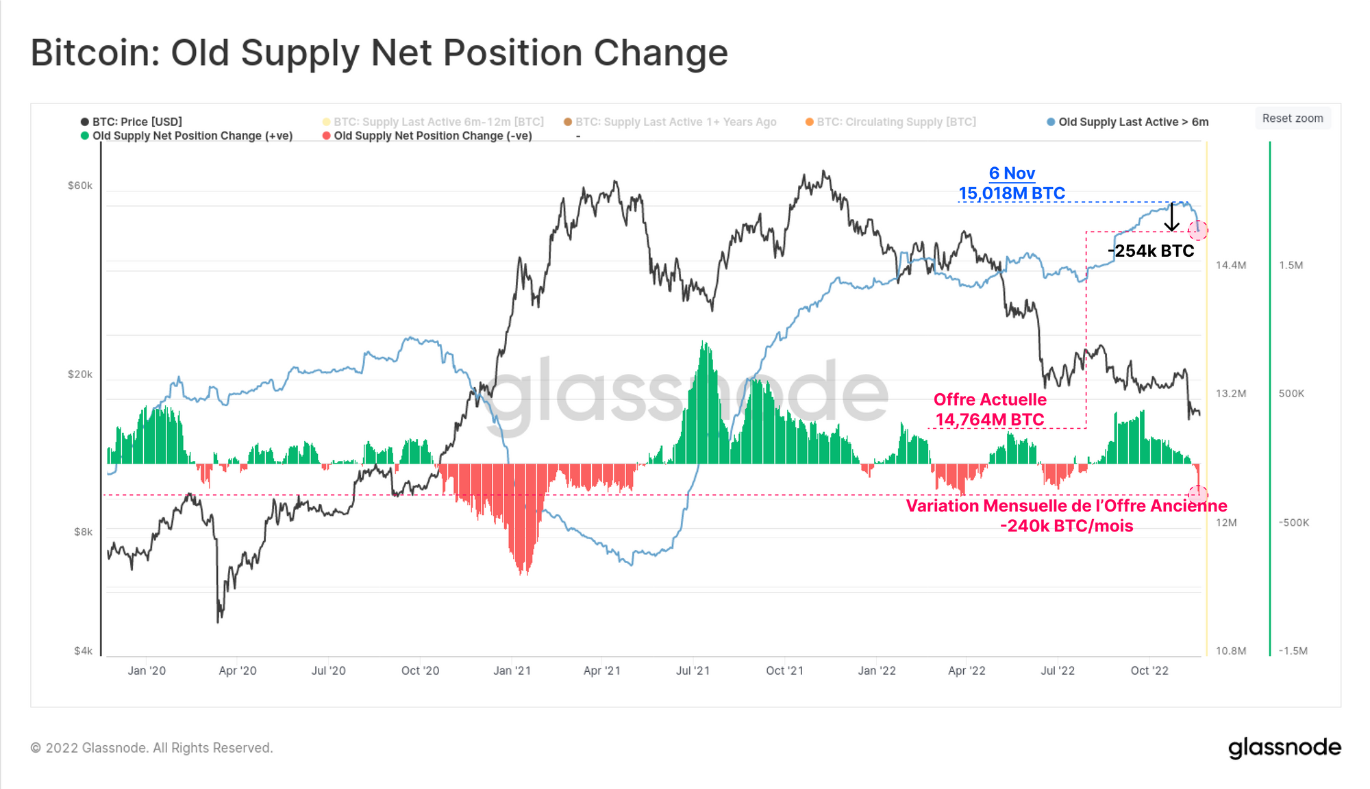 Depuis l'effondrement de FTX, un total de 254k BTC âgés de plus de 6 mois ont été dépensés, soit environ 1,3 % de l'offre en circulation. Sur une base mensuelle, il s'agit de la plus forte baisse de l'offre de pièces anciennes depuis le bull run de janvier 2021, lorsque les investisseurs à long terme prenaient des bénéfices dans la force du cycle haussier.