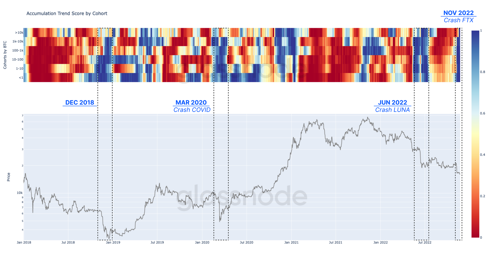 Le prix du BTC se négocie en dessous du prix réalisé (le coût de base du marché au sens large) depuis plus de 4 mois. Historiquement, cela a été corrélé avec la phase de formation de planchr, qui peut souvent être visualisée et évaluée à l'aide du Score de Tendance de l'Accumulation.