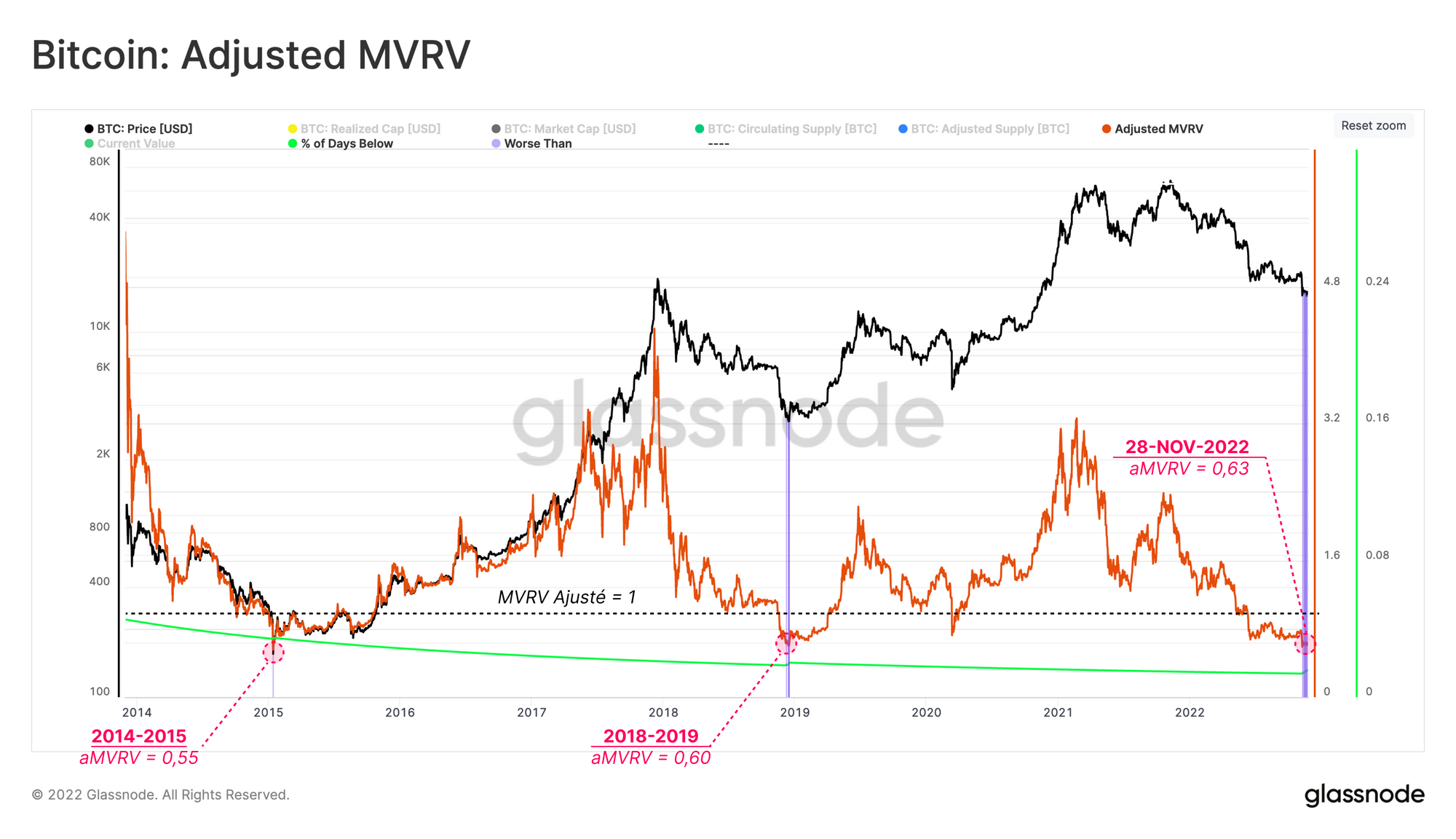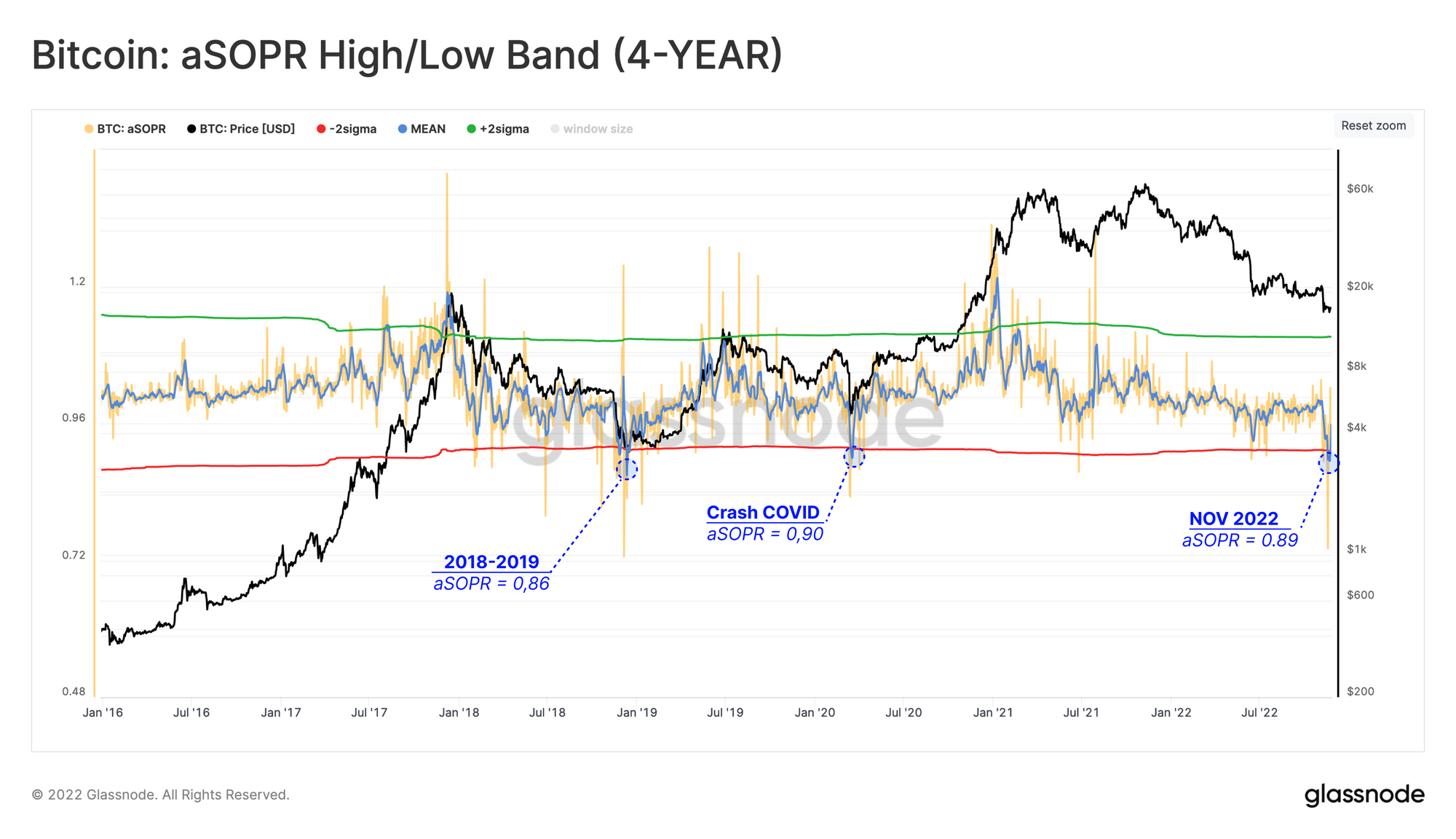La récente réaction du marché à l'effondrement de FTX s'est manifestée par une pasaage de l'aSOPR sous la bande basse pour la première fois depuis mars 2020. L'importance de cet événement n'est encore une fois comparable qu'au crash COVID et à la capitulation du marché en décembre 2018.