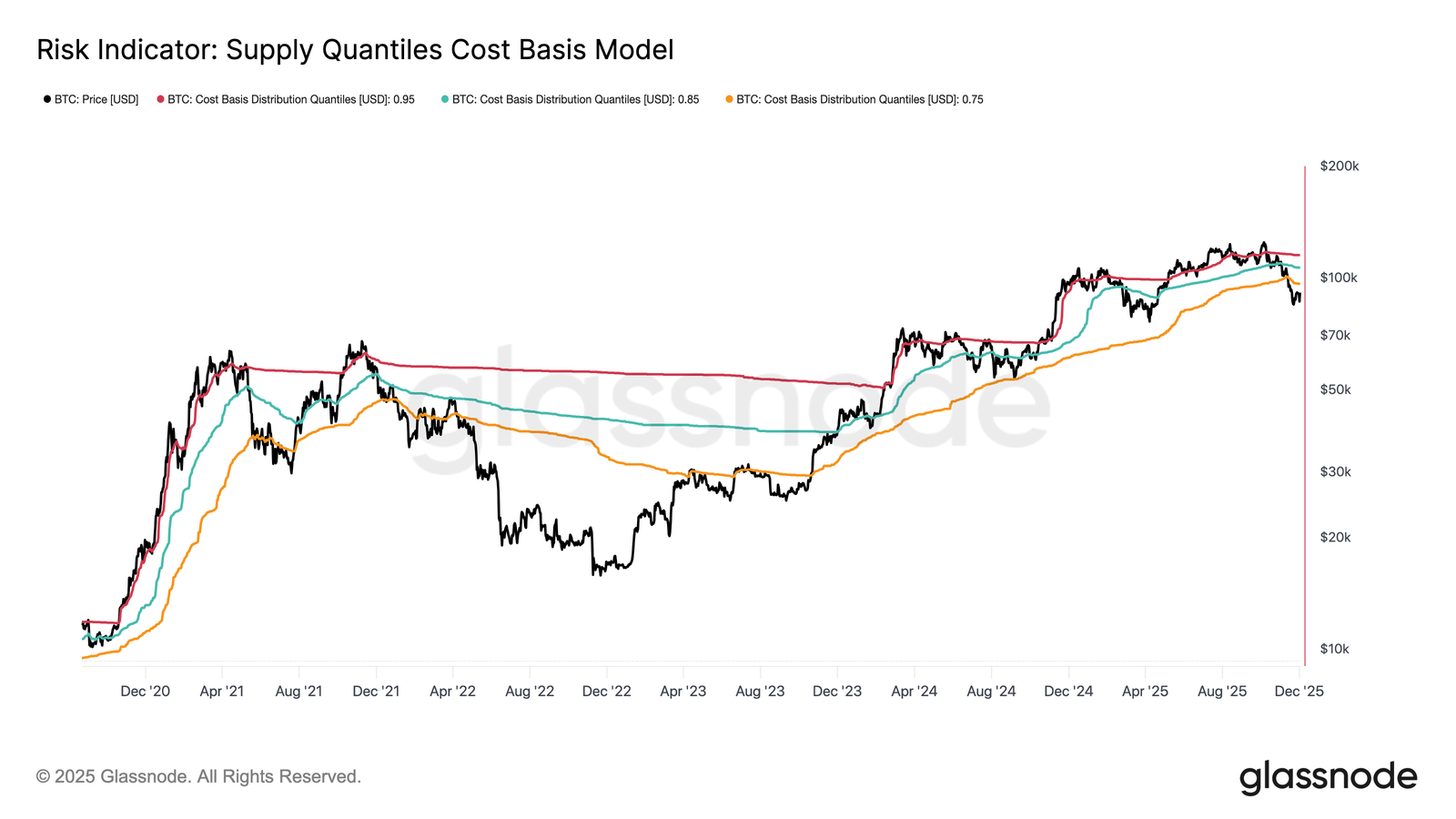 En utilisant le modèle de coût de base des quantiles d'offre, qui suit le coût de base des groupes d'offre détenus par les principaux acheteurs, la similitude devient plus évidente. Depuis la mi-novembre, le prix spot est tombé en dessous du quantile 0,75, s'échangeant désormais près de 96 100 dollars, ce qui place plus de 25 % de l'offre sous l'eau.