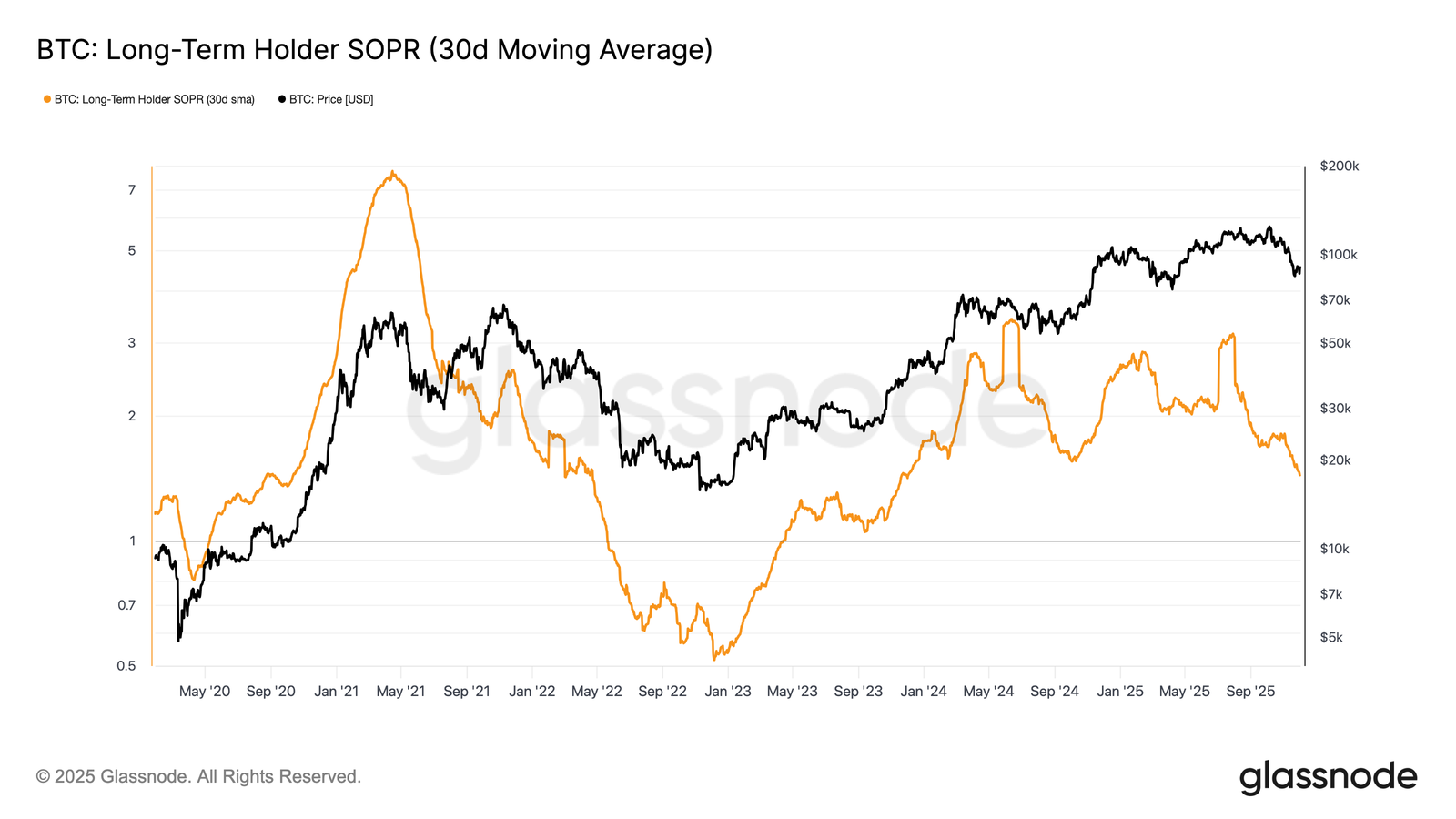 Le SOPR (30D-SMA) des investisseurs à long terme (LTH), qui mesure le rapport entre le prix au comptant et le coût de base des LTH qui dépensent activement, a fortement baissé parallèlement au prix, mais reste supérieur à 1 (actuellement 1,43).